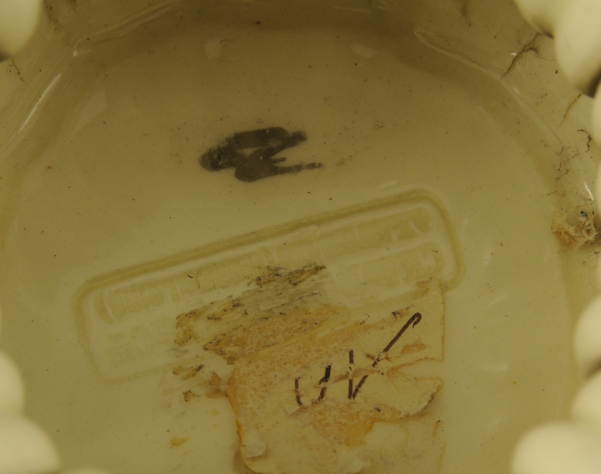 LANGEAIS. CORBEILLE cache-pot circulaire en faïence fine à fond blanc crémeux. Anses mobiles et décor de pampres de vigne et de grappes relevé de lustre platine. Marque en creux sous la base: "Ch. de Boissimon et Cie à Langeais (Indre-et-Loire)". Fin XIXème. Haut. 15, Diam. 18 cm.
