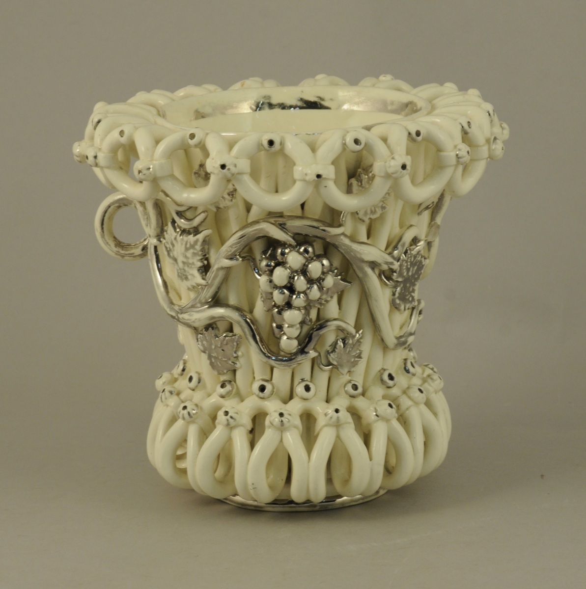 LANGEAIS. CORBEILLE cache-pot circulaire en faïence fine à fond blanc crémeux. Décor de pampres de vigne et de grappes relevé de lustre platine. Marque en creux "Charles BOISSIMON &Cie à Langeais". Fin XIXème. Haut. 18, Diam. 19 cm. (manques)