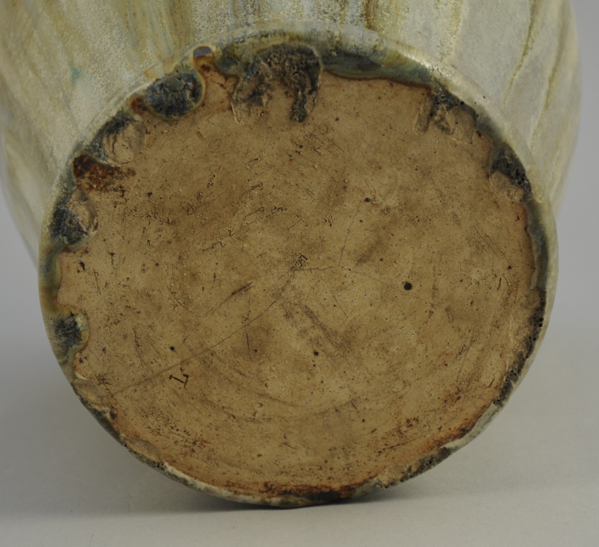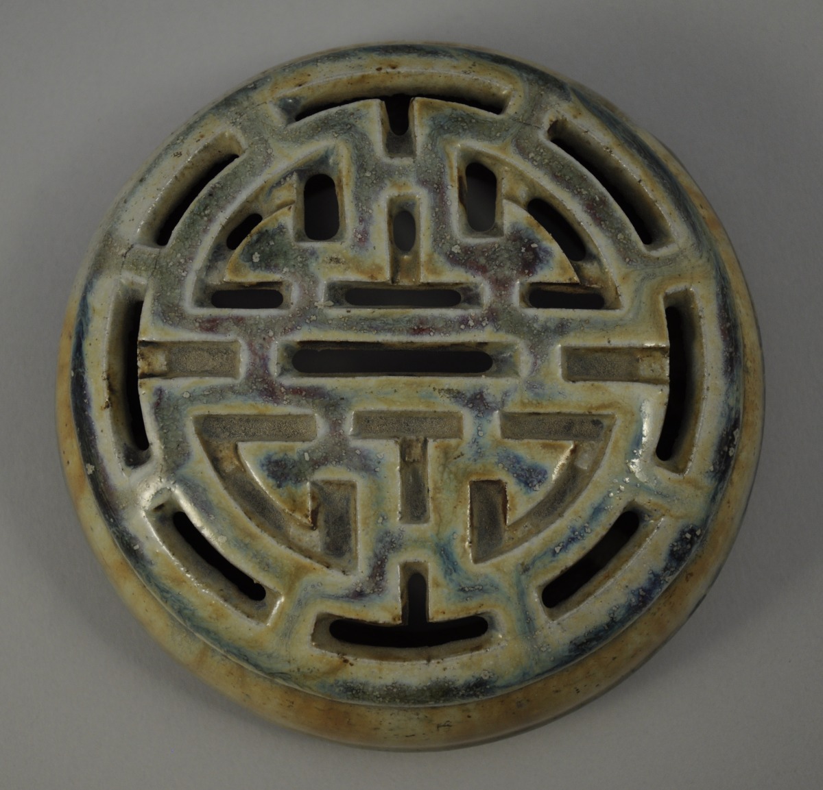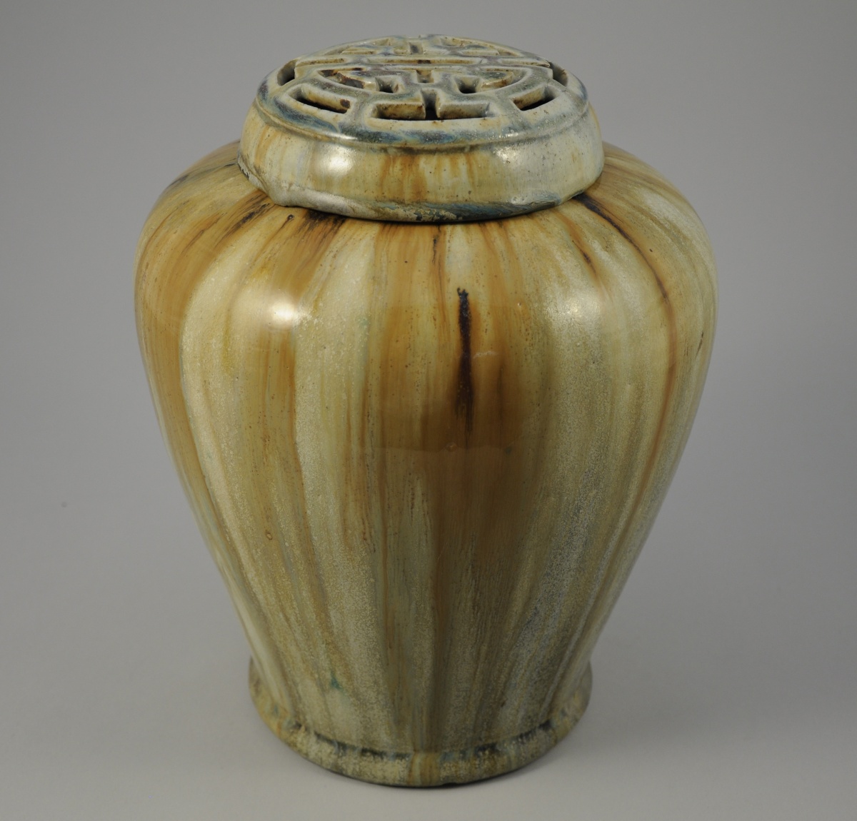 POT COUVERT en grès émaillé beige flammé. Couvercle ajouré d'un caractère " shou " stylisé. Shiwan, XIXème. Haut. 30 cm.