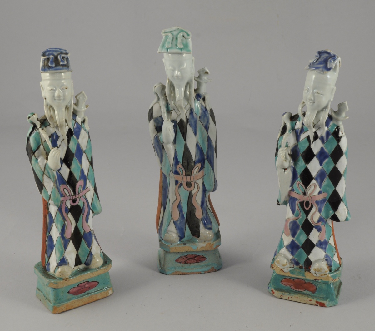 TROIS STATUETTES en porcelaine aux émaux de la famille rose représentant des arlequins. Chacune percée à l'arrière de la tête. Chine, vers 1800. Haut. 23,5 cm.