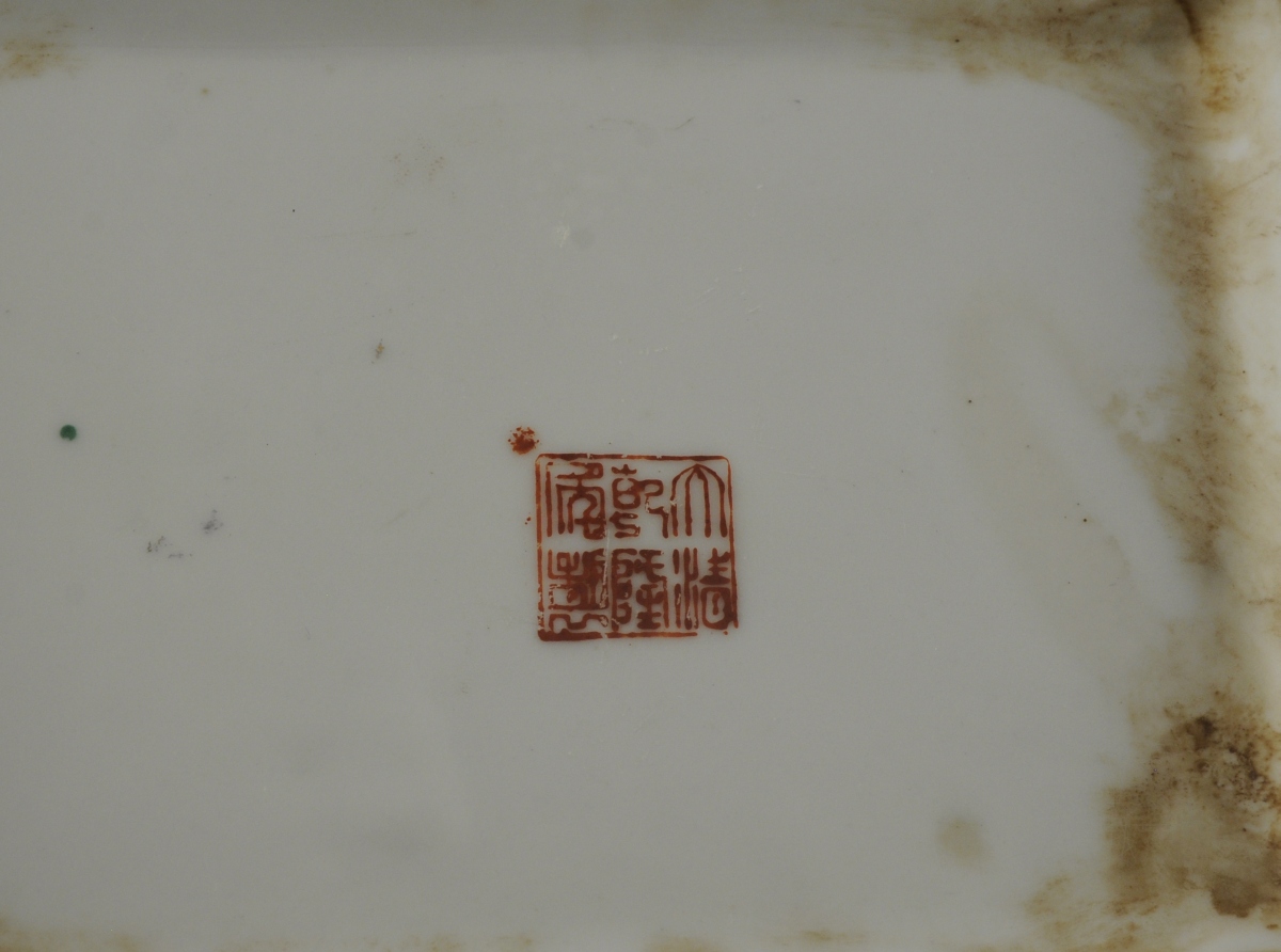 VASE en porcelaine à décor polychrome de chasseurs sur fond de paysage, dans le goût de la Compagnie des Indes. Anses décorées de grenades. Chine, XXème. Haut. 35 cm.