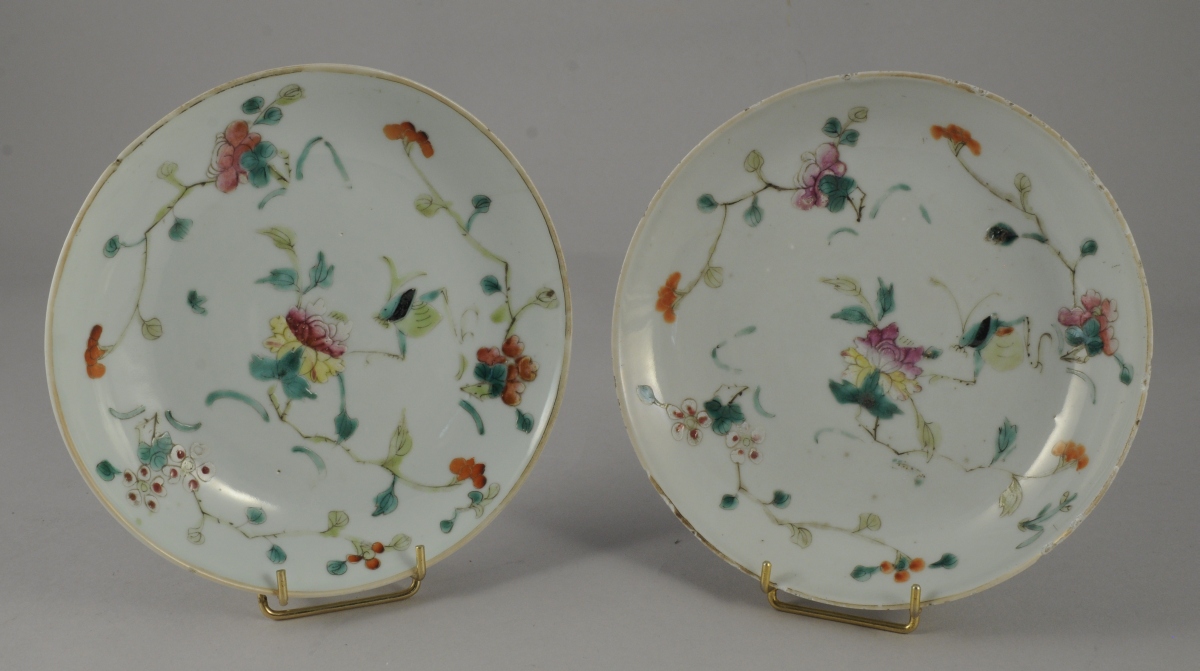 PAIRE D'ASSIETTES en porcelaine blanche à décor polychromes de pivoines, branches fleuries et d'une sauterelle. Au revers, marque apocryphe de Tongzhi. CHINE, XXème. Diam. 17,5 cm.