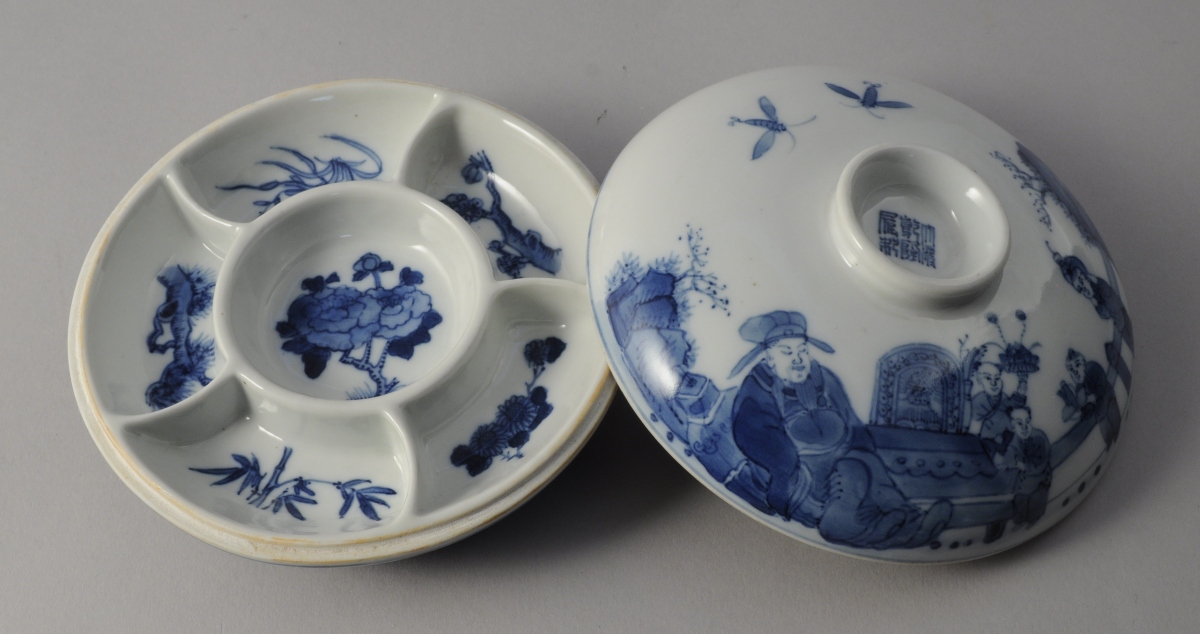 PALETTE de PEINTRE en porcelaine à décor camaïeu bleu sur fond blanc.