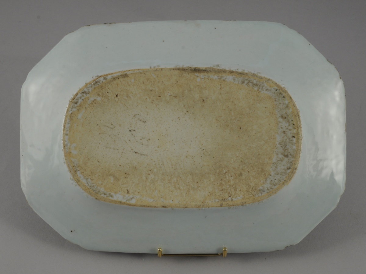 PLAT octogonal en porcelaine à décor en bleu et blanc d'un lac de montagne. Chine, XVIIIème. Long. 25, Larg. 17,5 cm.