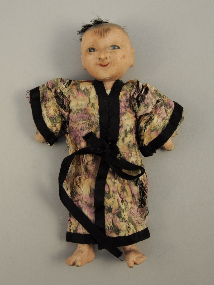 POUPÉE chinoise en biscuit habillée d'un kimono. Haut. 19 cm.