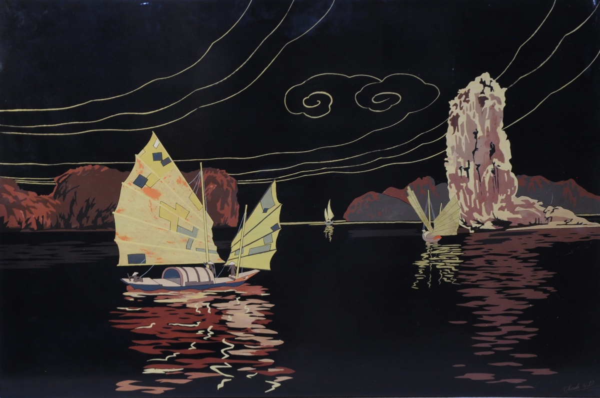 PANNEAU en bois peint à l'imitation du laque. Décor de jonques prenant la mer. 61 x 90 cm.