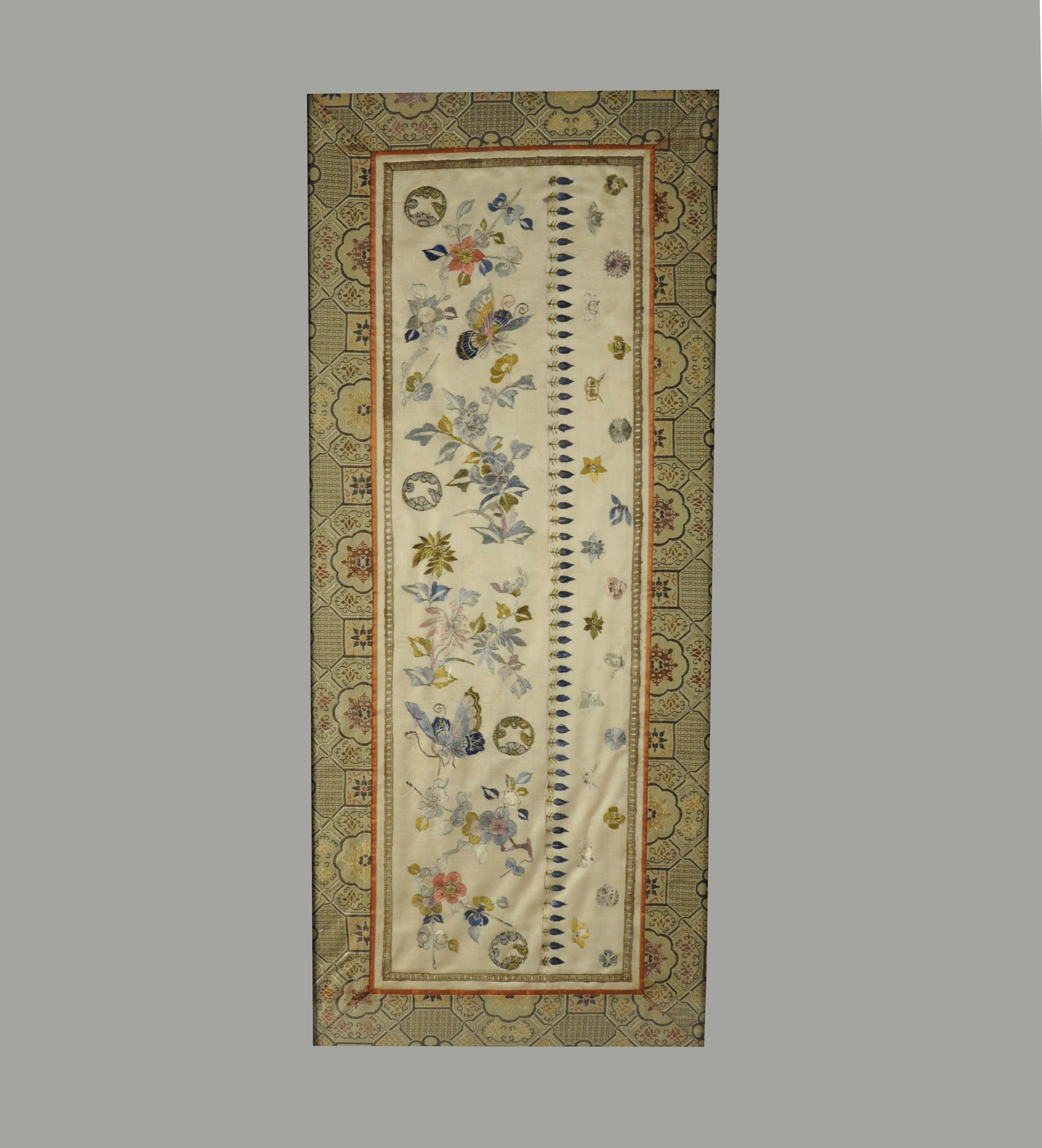 Deux BANDES DE MANCHES DE ROBE DE MANDARIN en soie beige à décor brodé de papillons parmi les pruniers en fleurs. CHINE, fin XIXème. Encadrées sous verre. Haut. 50,5, Larg. 15,5 cm.