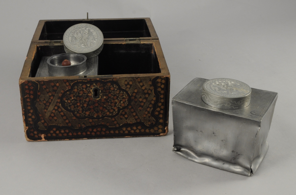 COFFRET à THÉ rectangulaire en laque rouge et or sur fond noir à décor floral stylisé. Il découvre deux boîtes à thé en étain estampé de fleurs et feuillages stylisés et volutes. Leurs couvercles ornés pour l'un, de pagodes et de grues dans un paysage. Dans le goût de la Chine. Fin XIXème. Haut. 12, Larg. 19,5, Prof. 13,5 cm. (manques, chocs, accidents)