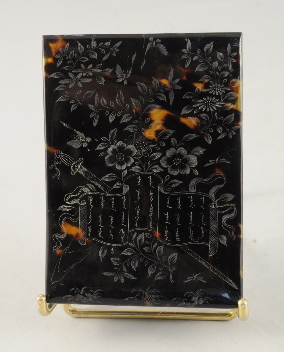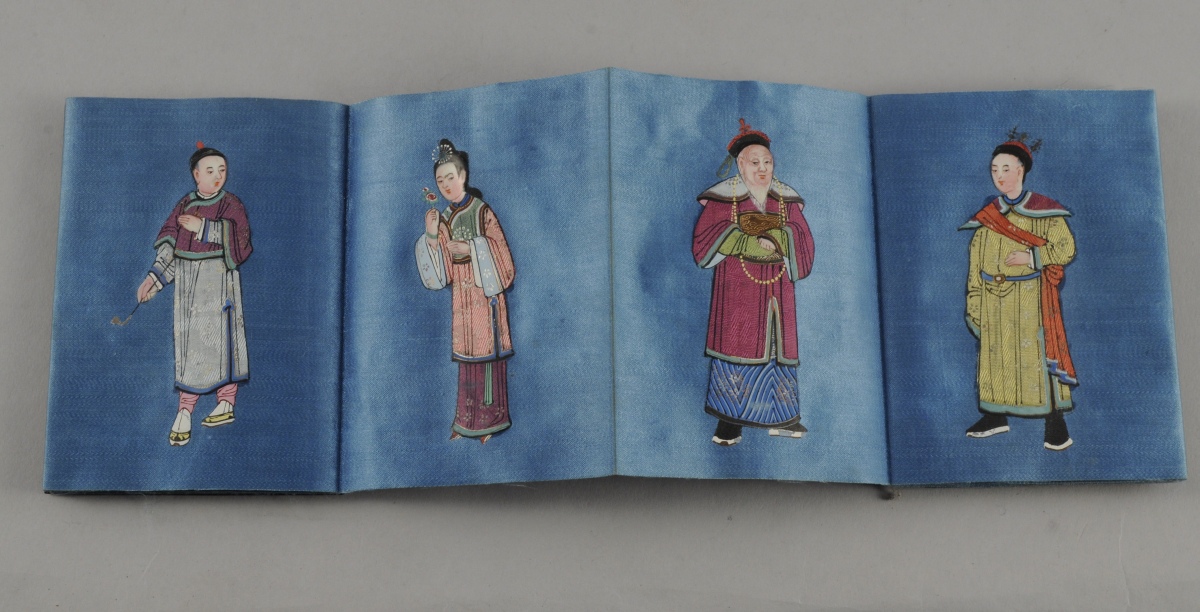 11 PERSONNAGES en soie, à tête rapportée dans un panoramique plant monté sur écaille. Boite en papier mâché et laqué. Canton, XIXème. Haut. 12, Larg. 9,5, Prof. 3,5 cm.