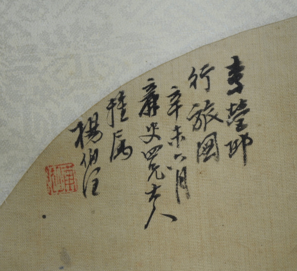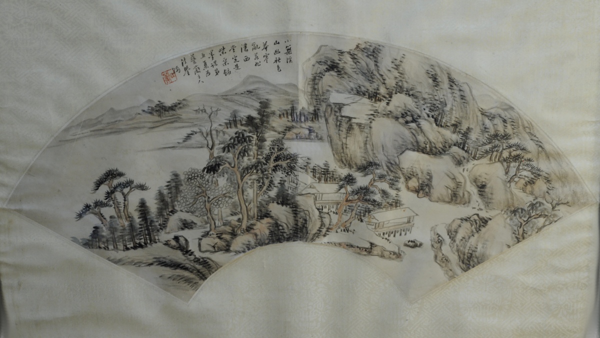 TROIS PROJETS D'ÉVENTAILS réunis dans un cadre. Chine, XXème. 19 x 54 cm et Diam. 24,5 cm.