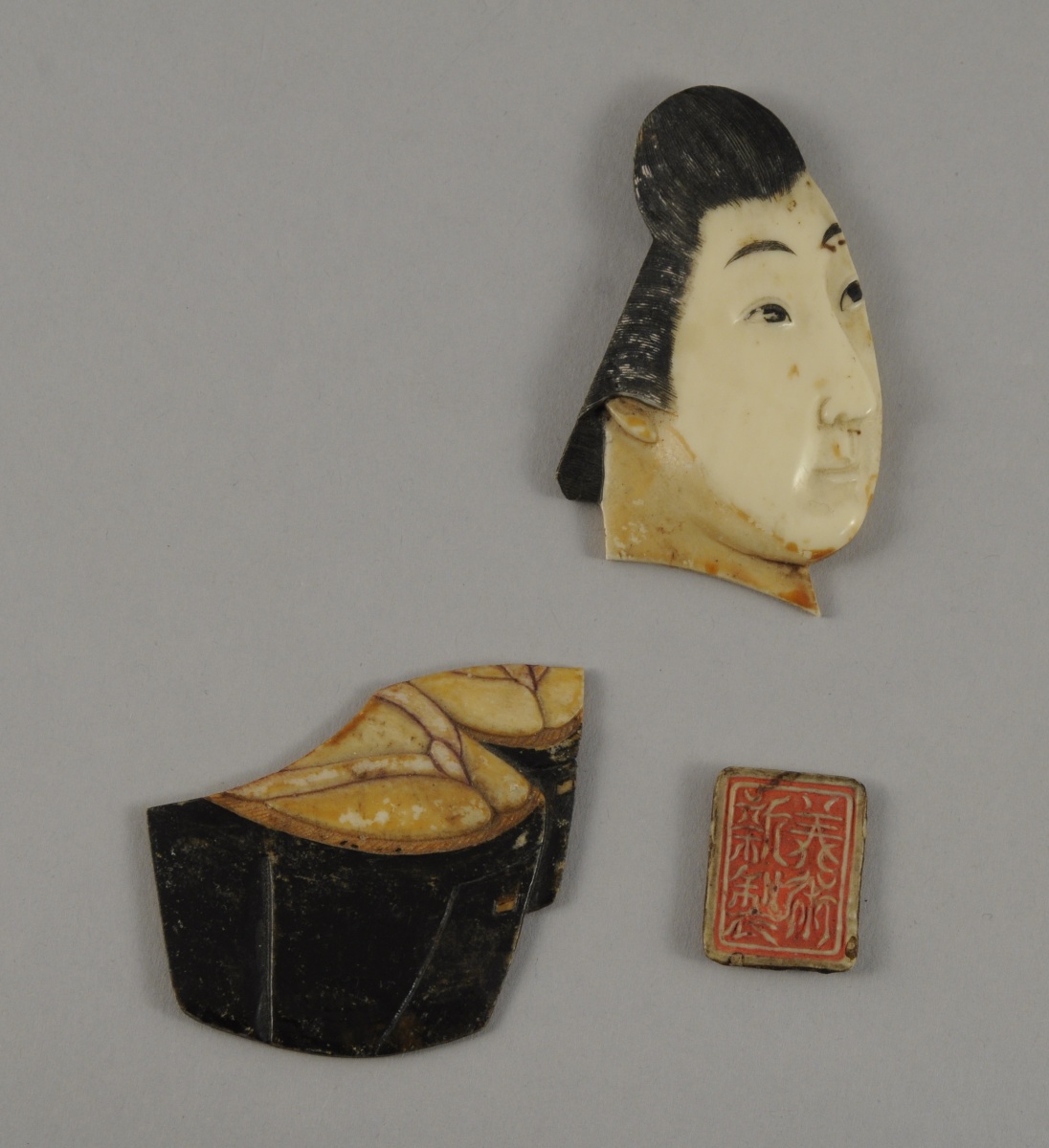RÉUNION DE 21 PLAQUES en os, ivoire ou nacre gravées et teintées figurant notamment quadrillages, plis de kimono, rivière, tête humaine et cartouche avec inscriptions. Japon? XIXème. Devaient former un bas-relief.