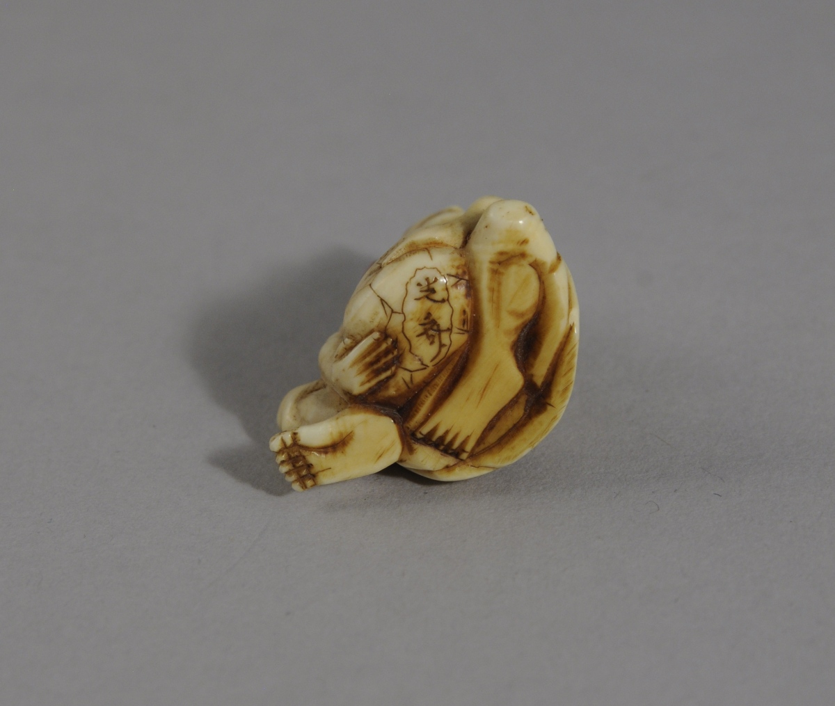NETSUKE en ivoire représentant un homme accroupi tenant un vase contenant une plante rouge (corail?). Japon. Caractères japonais sur le dessous. Fin XIXème - Début XXème. Haut. 3, Larg. 2,5 cm.