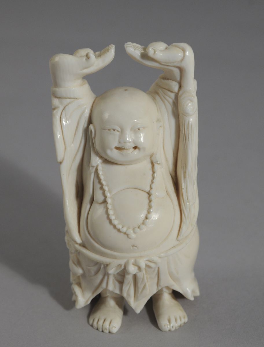 BOUDDHA en ivoire sculpté levant les bras au ciel. Chine,...
