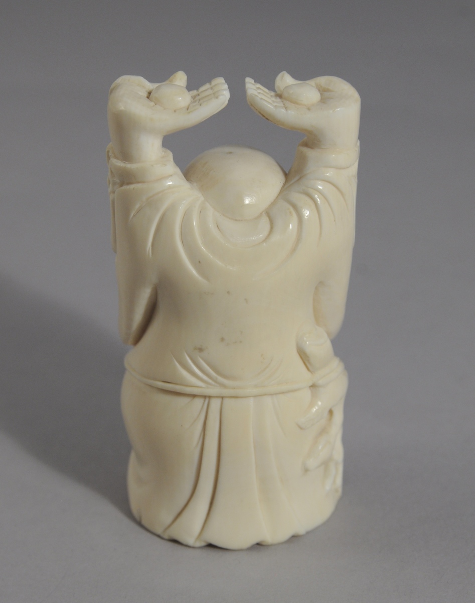 BOUDDHA en ivoire sculpté levant les bras au ciel. Chine, XXème. Haut. 8,5 cm.