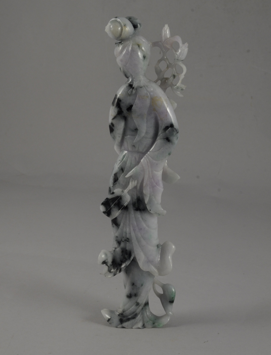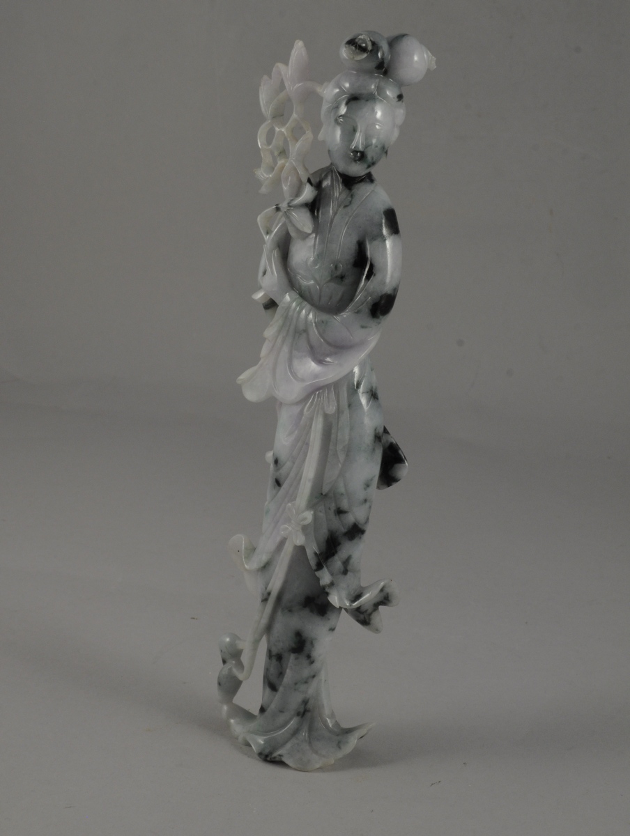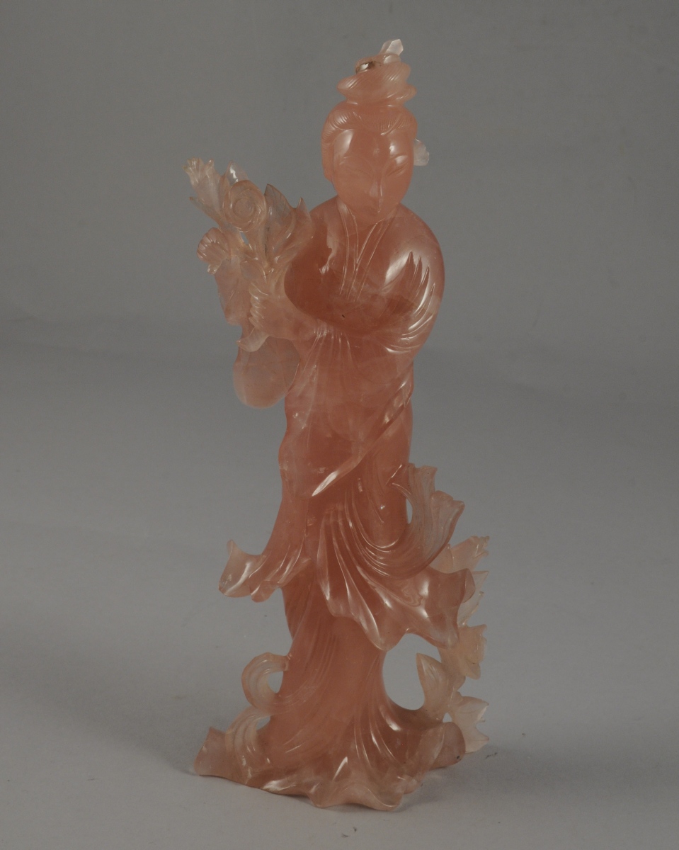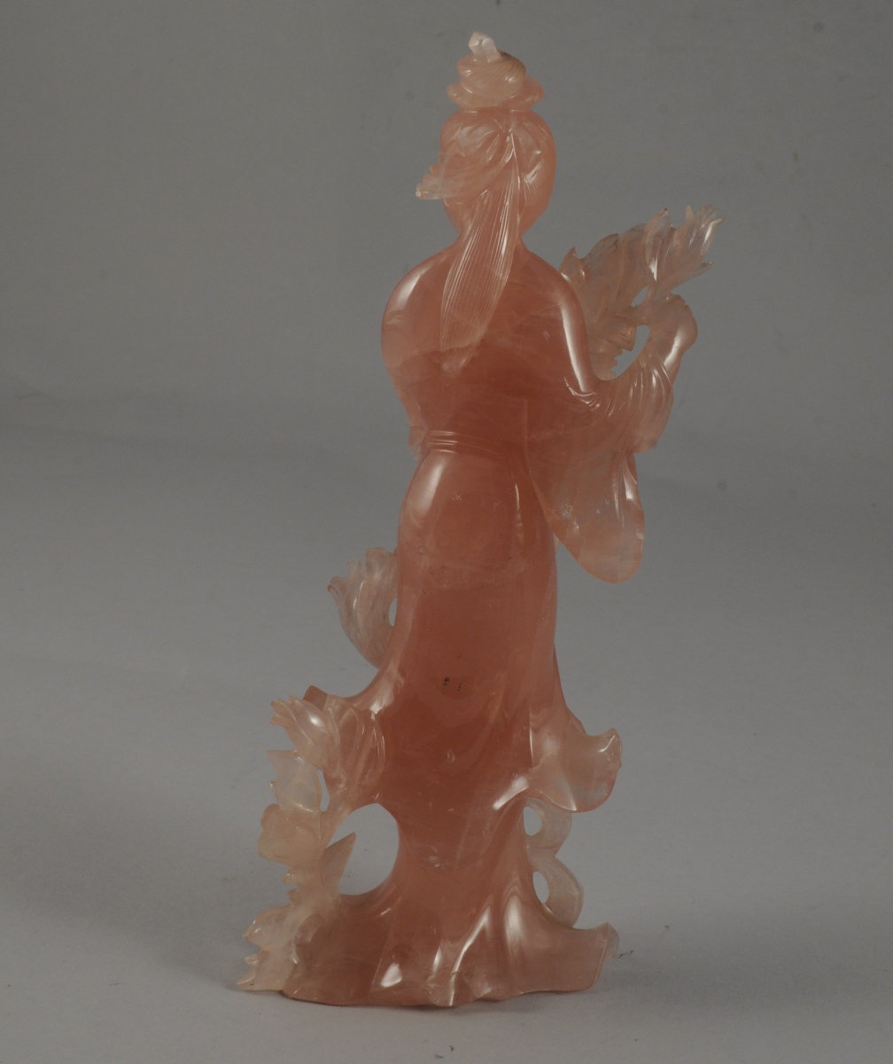 DEUX STATUETTES féminines en pierre dure rose et verte. Dans un coffret de toile jaune. Chine, XXème. Haut. 19 cm.