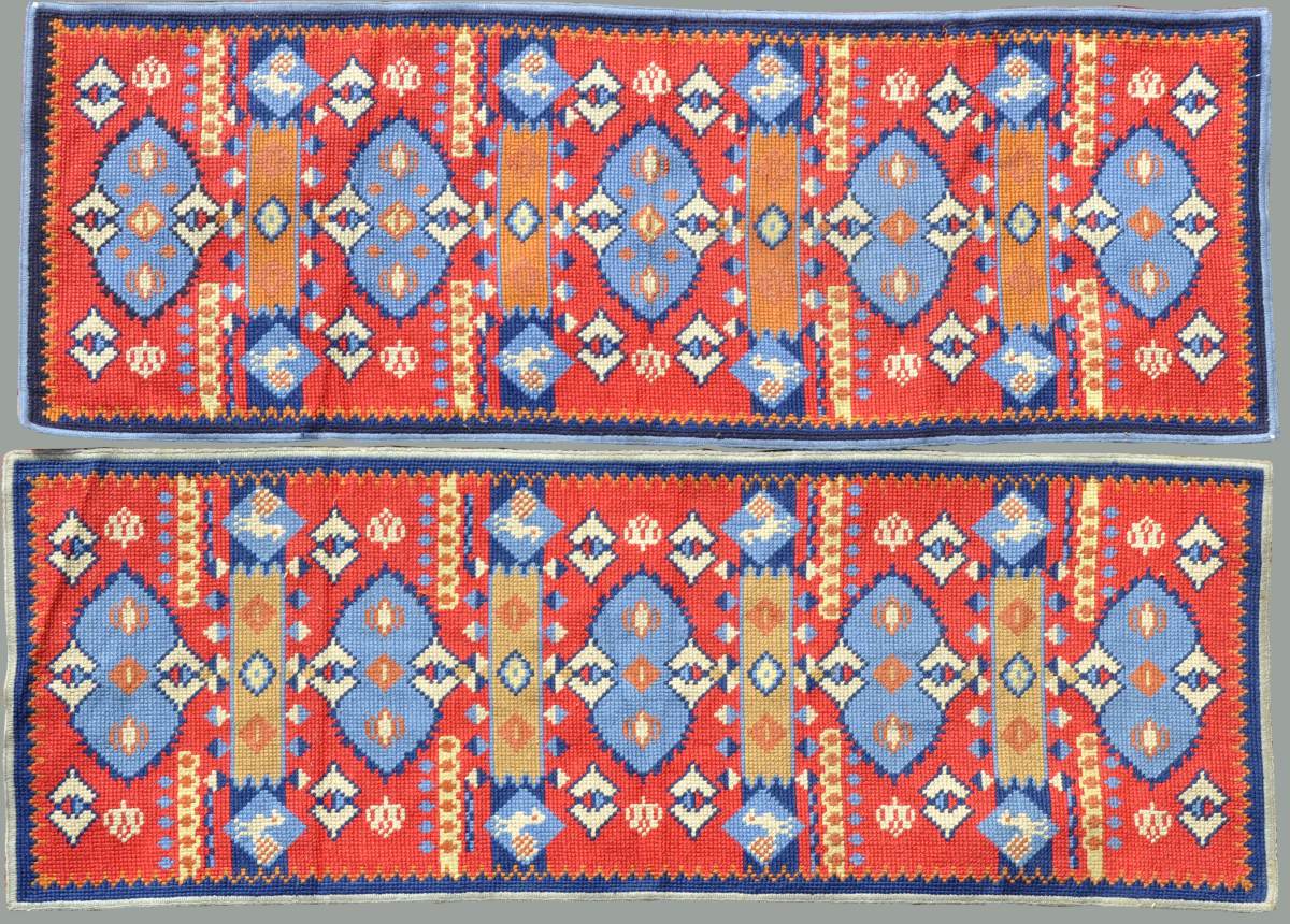 - PAIRE de GALERIES en laine à motifs géométriques sur fond rouge. 161 x 60 cm.