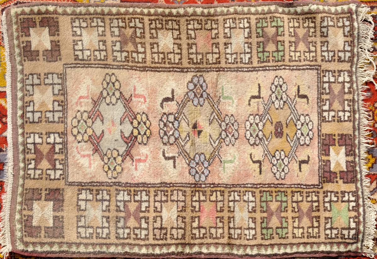 TAPIS de style caucasien en laine à motif de trois médaillons losangiques sur fond beige. 111 x 80 cm.