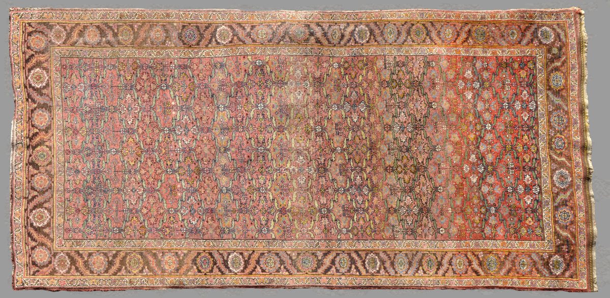 TAPIS d'Iran en laine à motif floral sur fond rouge. Bordure à motif de médaillons alternés de feuillages. 270 x 144 cm. (usures)