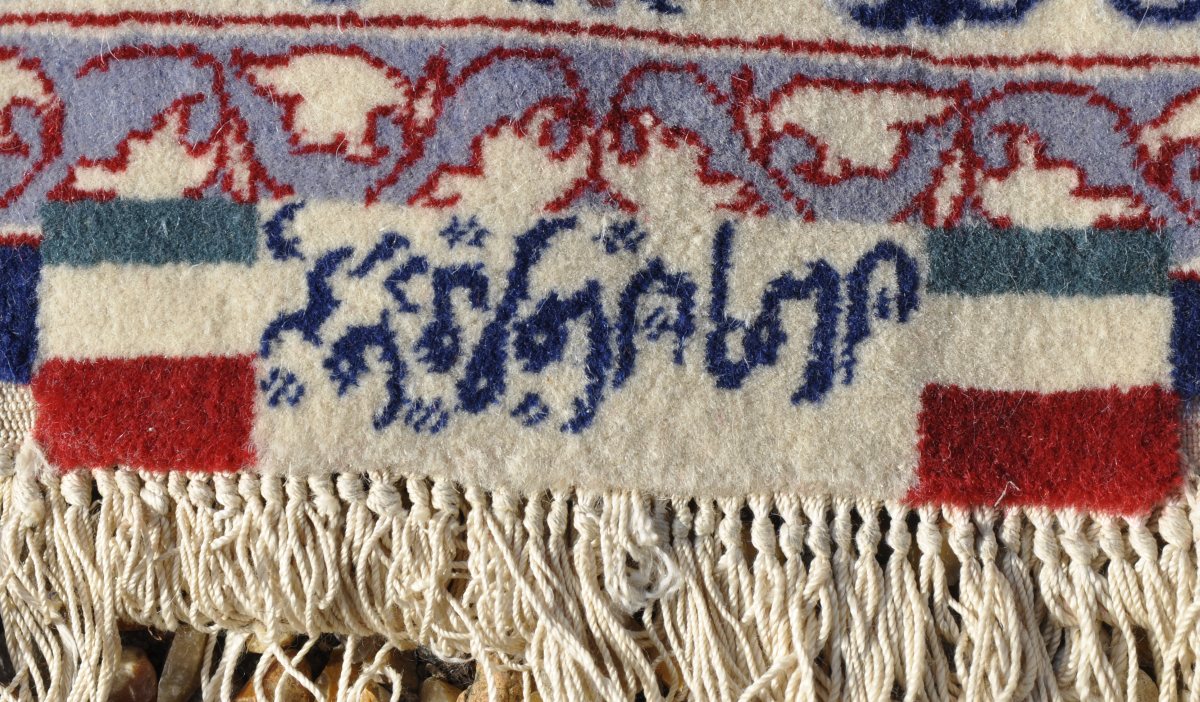 TAPIS d'Asie mineure, Ispahan (?) en laine à motif de médaillon étoilé au centre d'une réserve ovale rouge à décor de rinceaux fleuris. Bordure principale à décor de rinceaux fleuris sur fond bleu. Porte une inscription mordant sur la bordure exterieure. 240 x 152 cm.