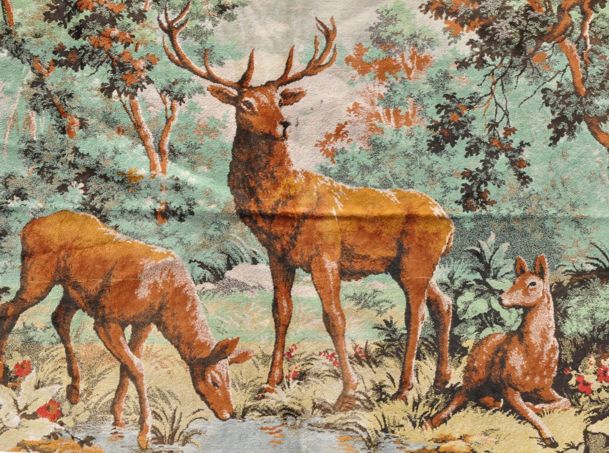 JOINT: TAPIS mécanique moderne à décor de cerf et de biches dans un sous-bois. 170 x 118 cm.