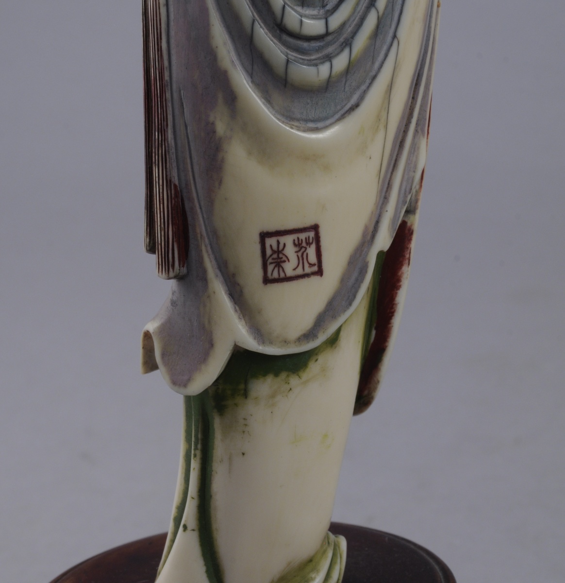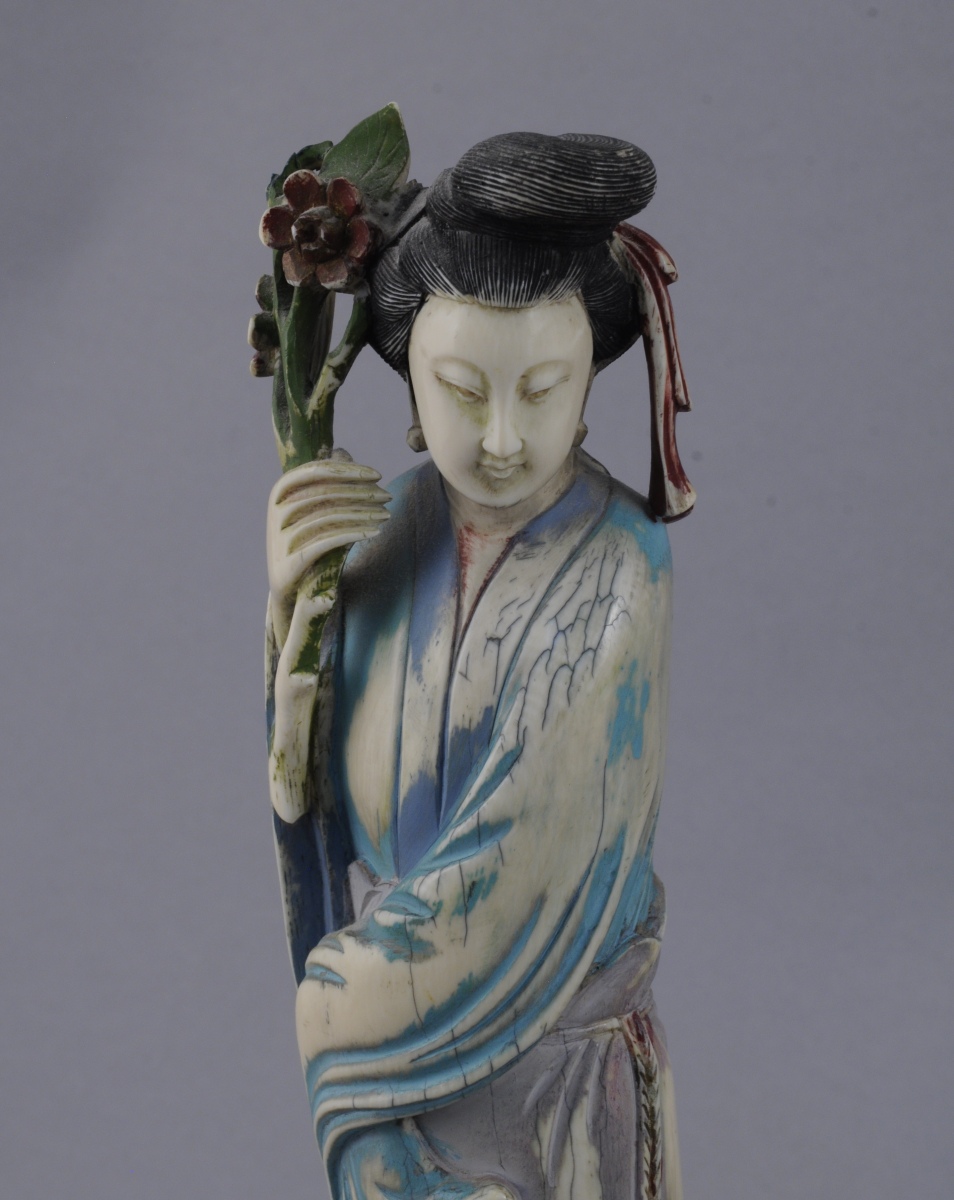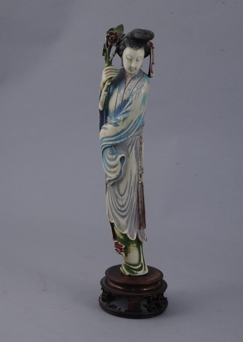 STATUETTE en ivoire sculpté polychrome représentant une femme tenant un branchage fleuri. Porte une signature. Chine, XXème. Haut. 31,5 cm. Sur son socle de bois noirci.