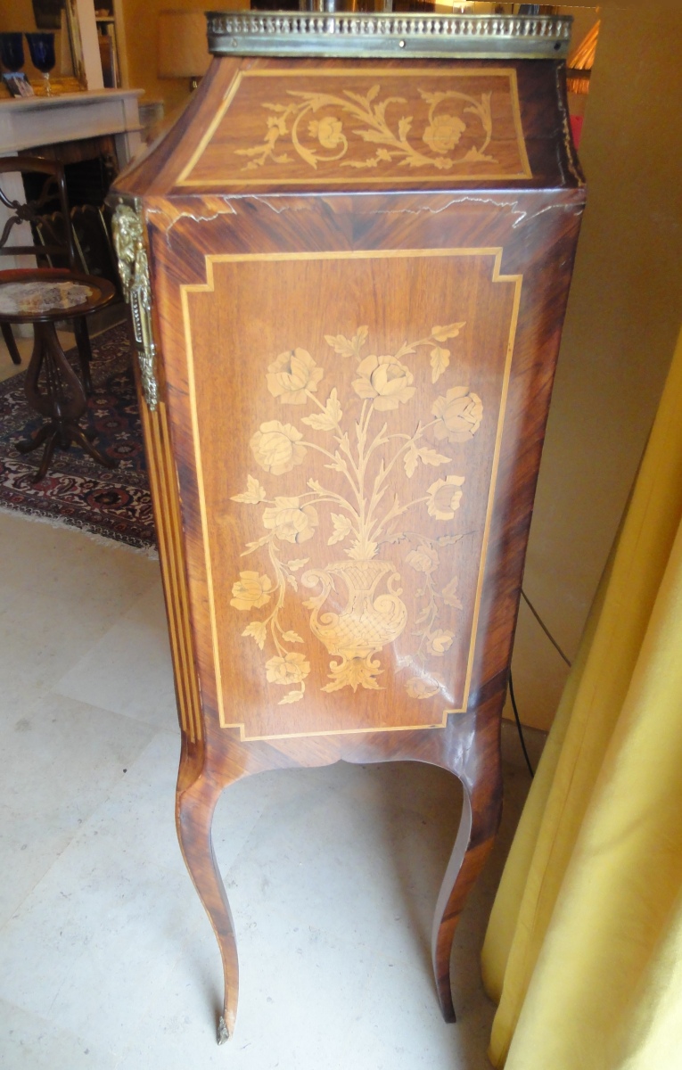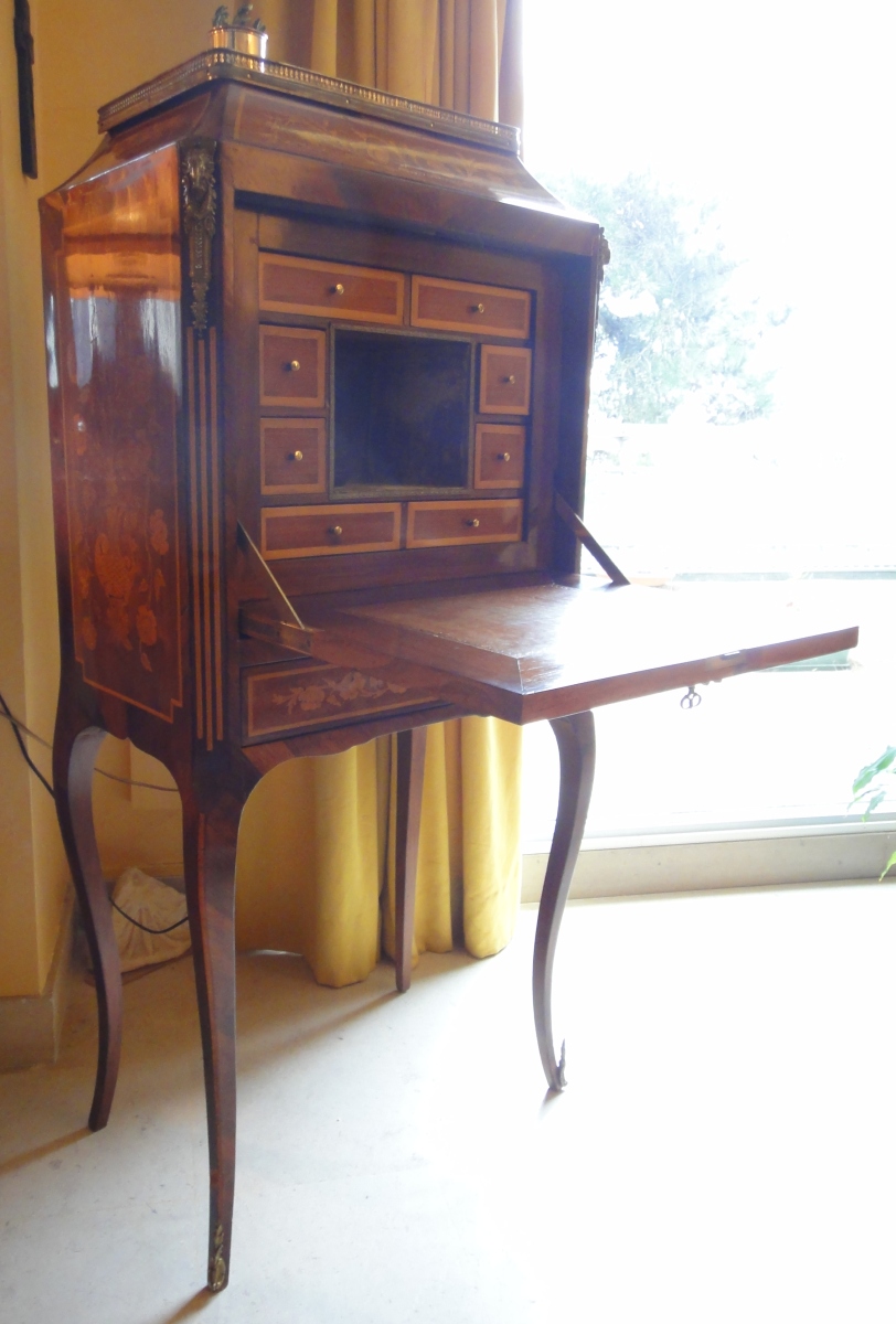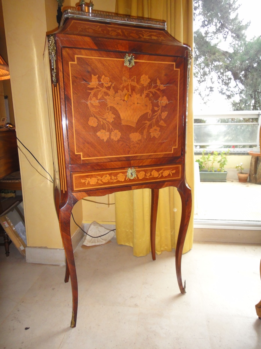 SECRÉTAIRE de dame à abbatant en placage de bois de rose, à décor marquté de paniers fleuris en façade et sur les côtés. Il repose sur 4 pieds cambrés. Garniture de bronze doré. Style Transition.