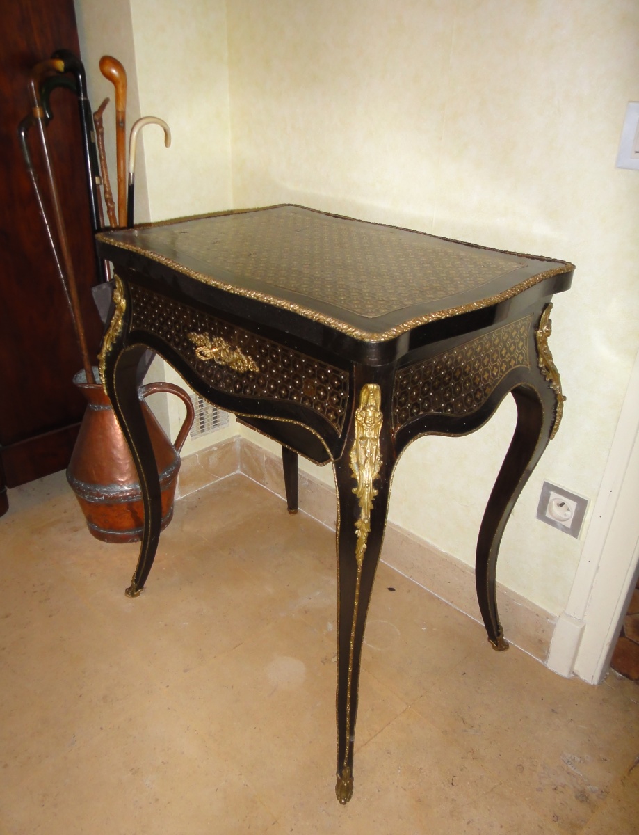 TABLE À OUVRAGE en bois noirci, à décor marqueté de laiton et nacre. Garniture de bronze doré. Style Louis XV, Napoléon III.