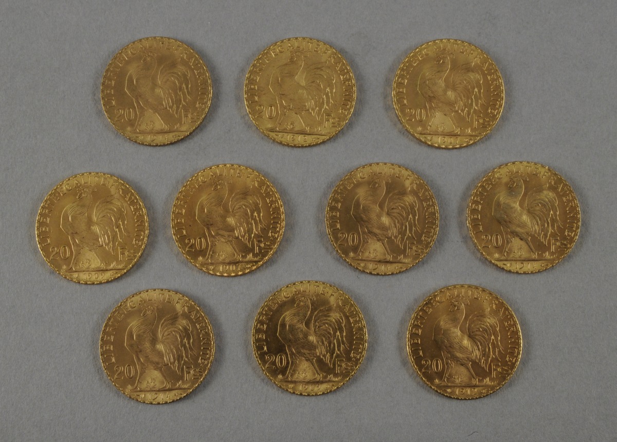 FRANCE, 10 pièces de 20F or, au coq, quatre de 1914, deux de 1907, deux de 1909 et deux de 1912.
