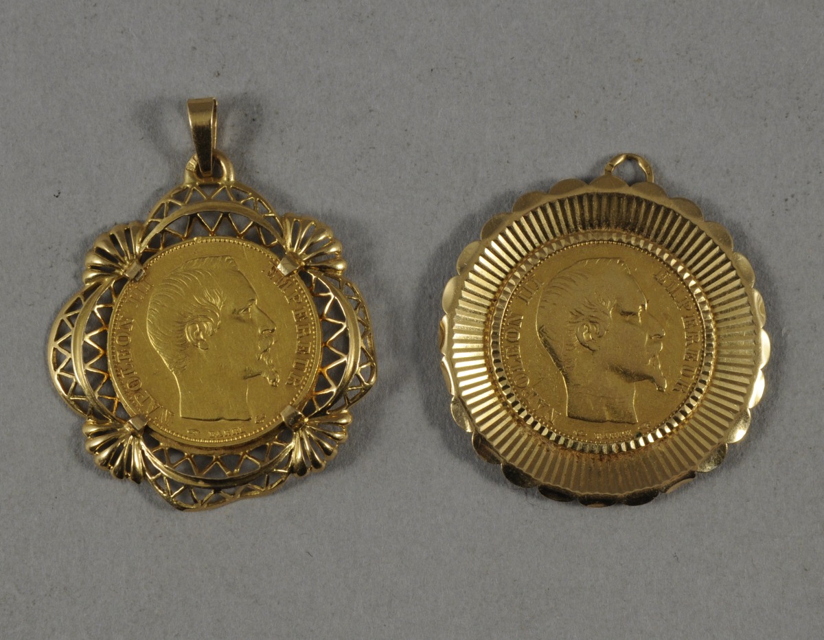 -Le second présente une ornementation ajourée de dents de loup sur les quatre lobes principaux et de godrons sur les quatre autres. Il est serti, en son centre, d'une pièce de 20 F or de 1858 figurant Napoléon III tête nue. Diam. 3,3 cm. Poids: 9,4 g.