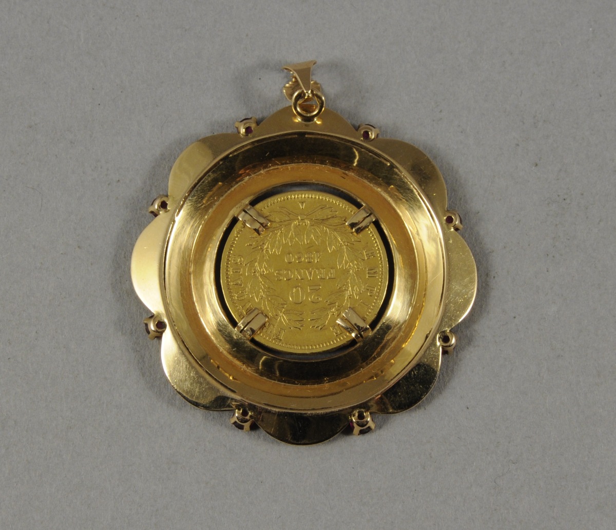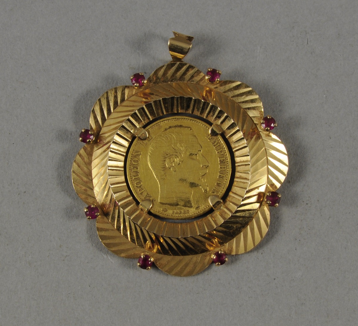 PENDENTIF de forme polylobée en or jaune. Il est ciselé de cannelures et cannelures obliques. Les lobes alternent avec huit petits rubis. Il est serti, en son centre, d'une pièce de 20 F or de 1860 figurant Napoléon III tête nue. Fin XIXème, début XXème. Diam. 4,5 cm. Poids brut: 15,7 g.