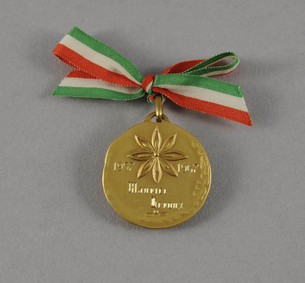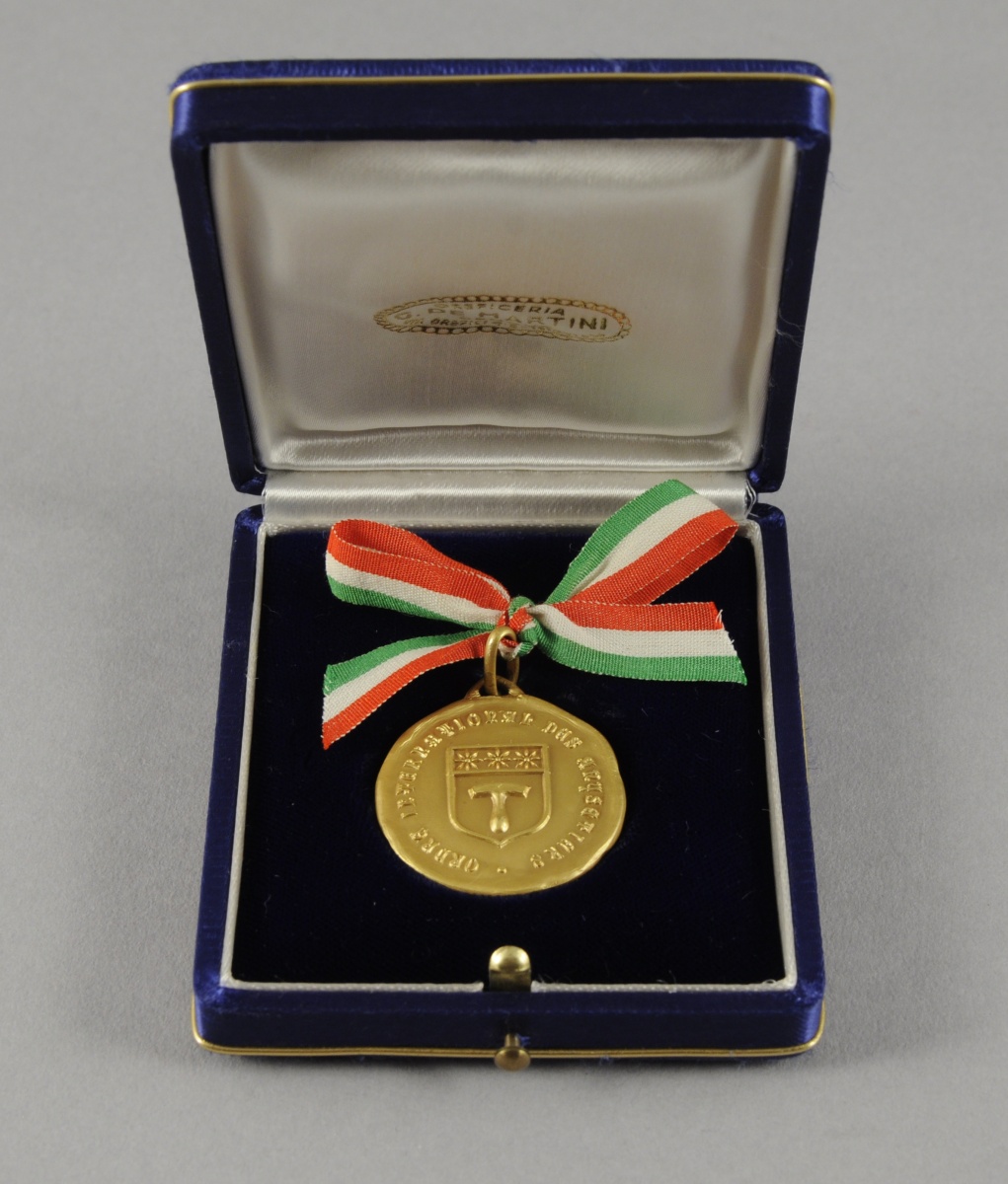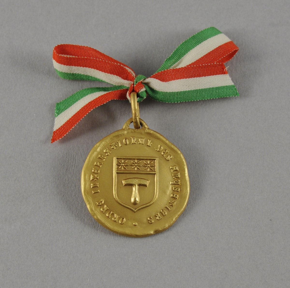 Mention manuscrite, sur un papier: "Médaille d'or frappée par la Grande Chancellerie Italienne à l'occasion du 10ème anniversaire des Commanderies Italiennes. / Remise à Florence - 2-5 mars 1968".