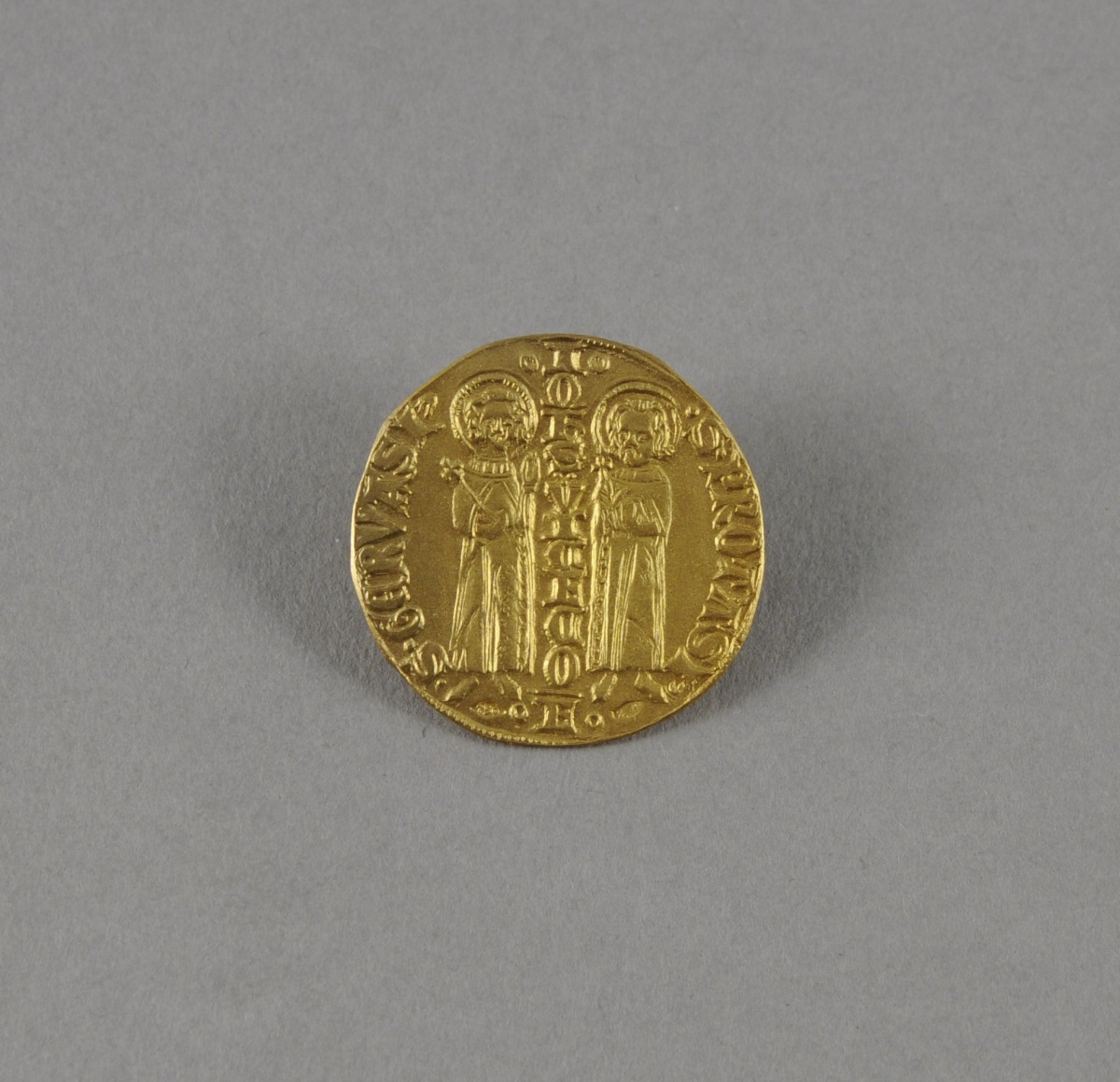 ITALIE. MÉDAILLE EN OR dite "Ambrogino d'oro" figurant, à l'avers, St Ambroise entouré de la mention ".S.AHBROSI. HEDIOLANVH. Le revers représente St Gervais et St Protais entourés de la mention ".S.GERVASI' S.PROTASI'" et centré de la mention "IÔÊS...VICECO-E". Poinçons italiens de forme hexagonale, l'un marqué "750" et l'autre "2(?)MI". XXème.