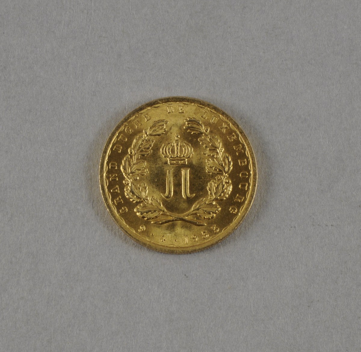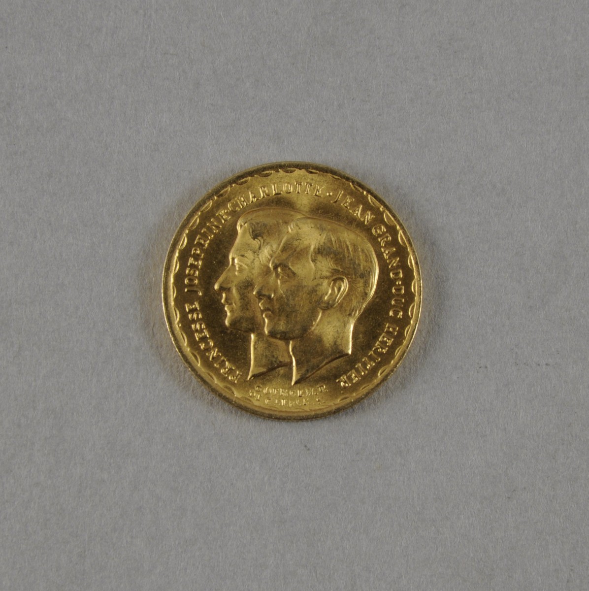 GRAND DUCHÉ DE LUXEMBOURG, MÉDAILLE COMMÉMORATIVE EN OR du mariage de la princesse Joséphine-Charlotte de Belgique et du Grand-Duc Héritier Jean, le 9 avril 1953. Elle présente, à l'avers, le profil des époux et, au revers, deux "J" adossés flanqués de deux branches de chêne. Signée "GOERGEN .P. / DE CLERCK .S.".