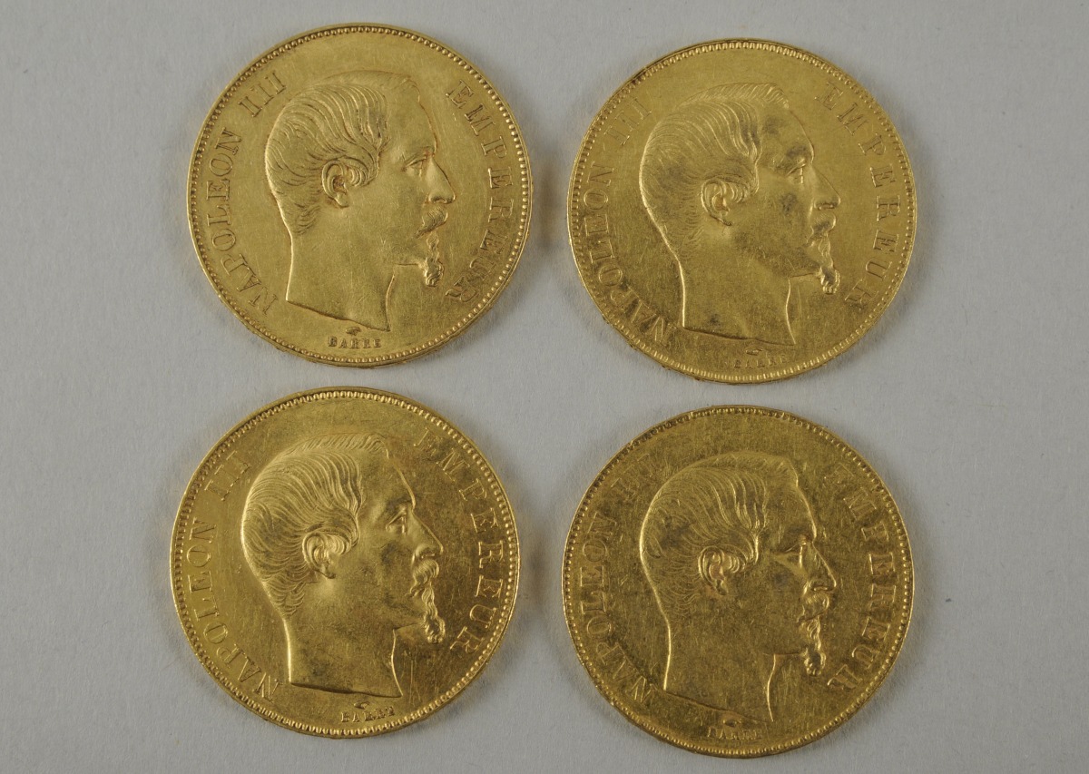 FRANCE, Napoléon III, 4 pièces de 50F, or, tête nue: 1855, 1856, 1857, 1859 (A).