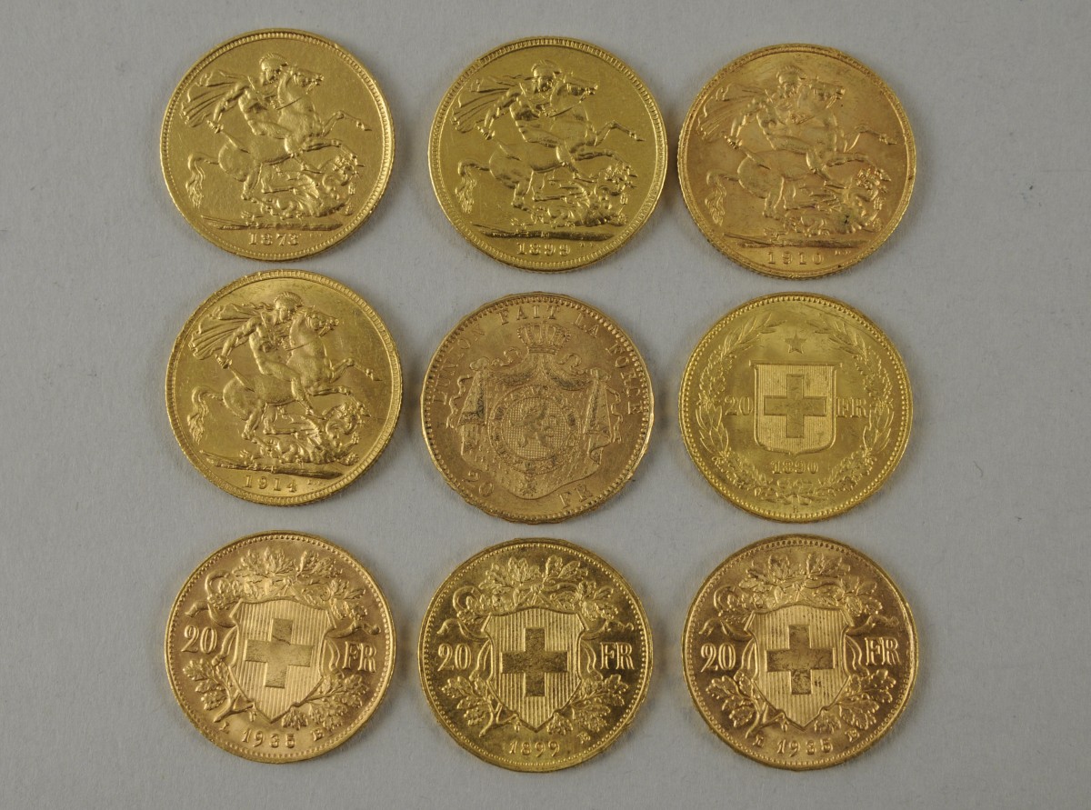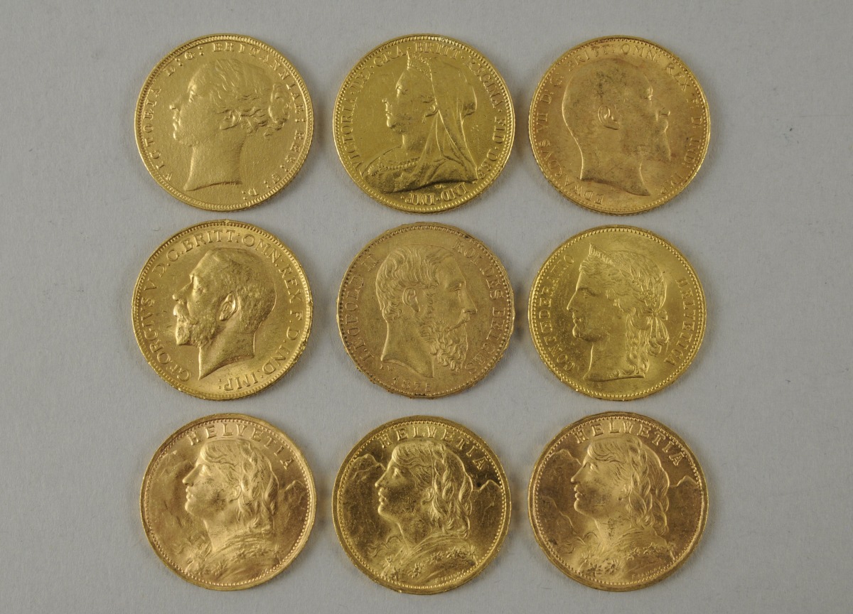 - GRANDE BRETAGNE, 4 pièces Souverain: Victoria 1873, 1899, Édouard VII 1910, George V 1914.