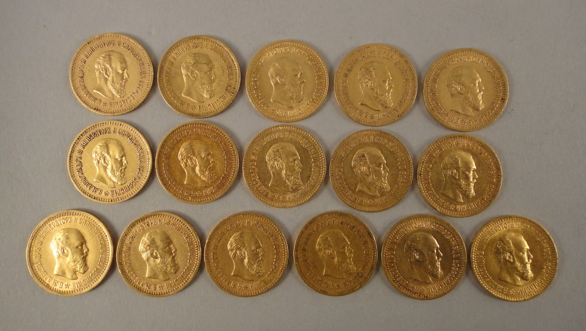 RUSSIE, 16 pièces de 5 roubles or, Alexandre III.