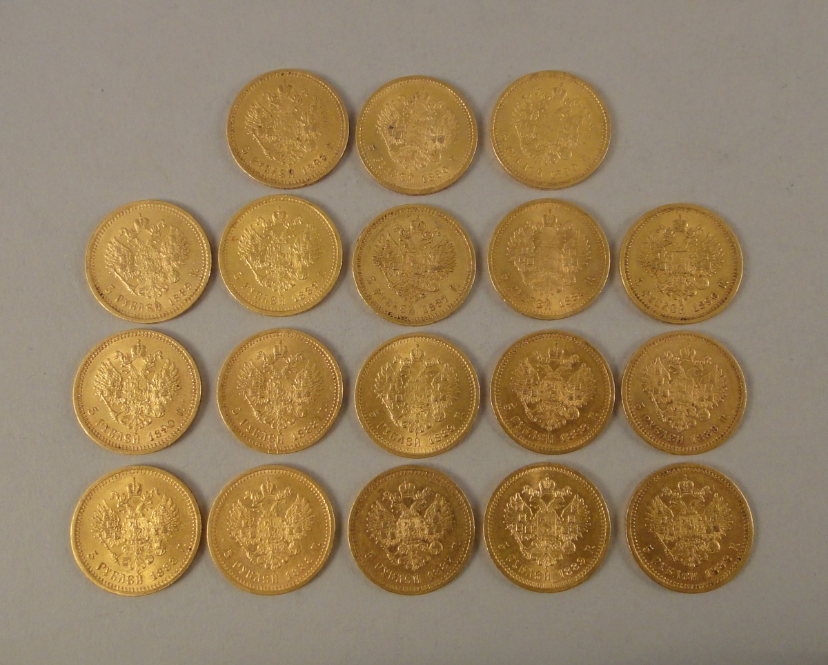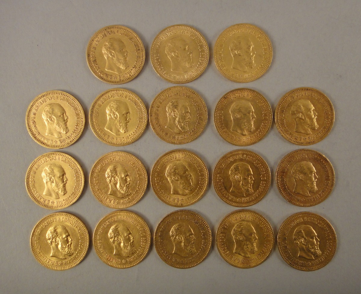 RUSSIE, 18 pièces de 5 roubles or, Alexandre III.