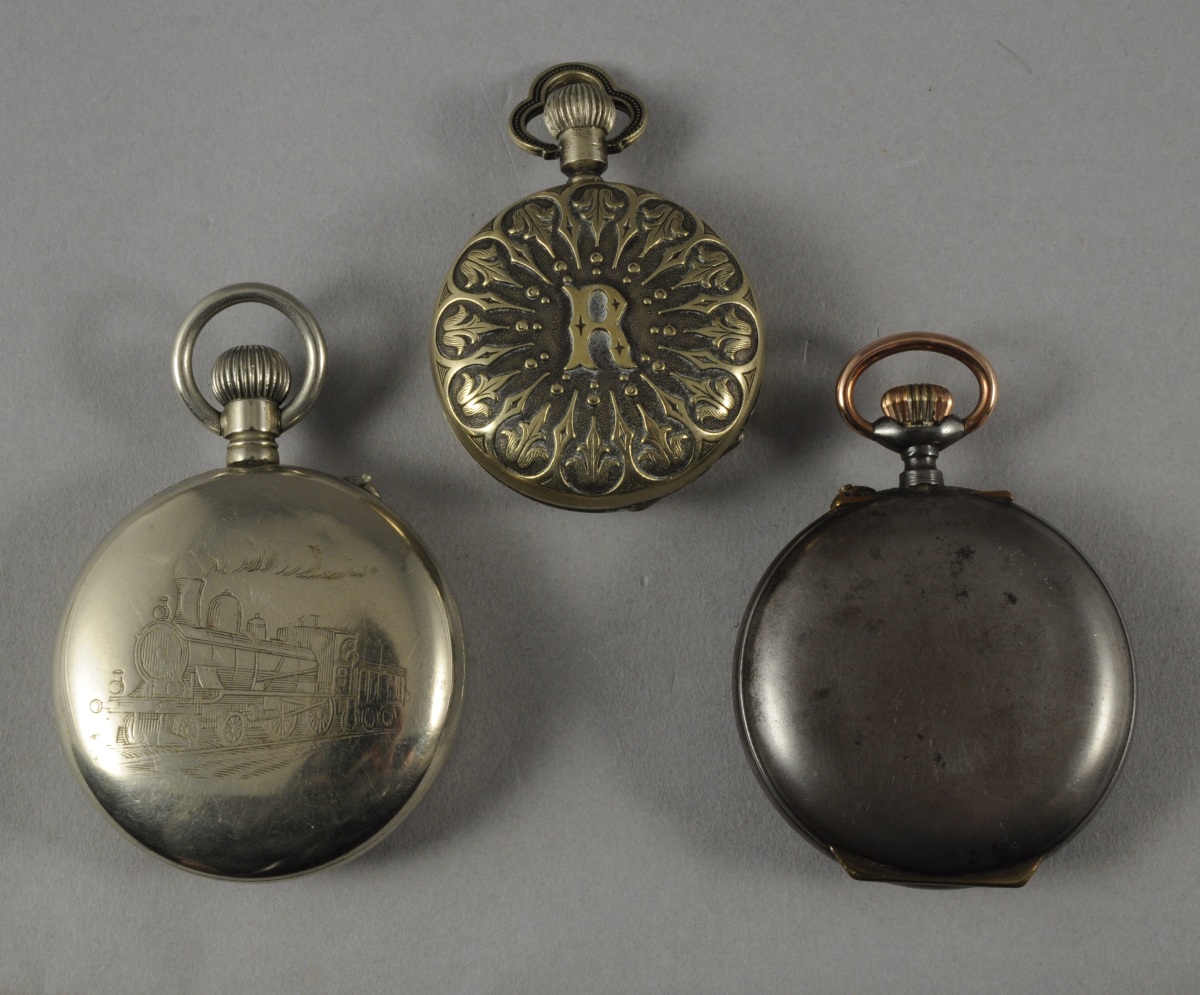 -La troisième en métal anciennement argenté, à double cadran émaillé blanc indiquant les heures en chiffres romains et les secondes. Le dos du boîtier gravé d'une locomotive. Signée "Cortebert / Supérieure".