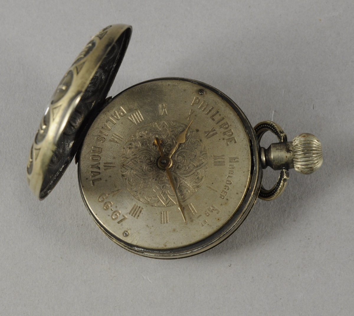 -La première en métal anciennement argenté à cadran en métal ciselé d'agrafes et de volutes feuillagées indiquant les heures en chiffres romains. Le tour du cadran à décor polylobé indiquant les heures en chiffres romains. Le dos du cadran à décor d'une rosace formée d'éléments lancéolés et dont les arcatures referment un fleuron. Centrée du chiffre "R". L'anneau de bélière de forme trifoliée. Fin XIXème, début XXème.