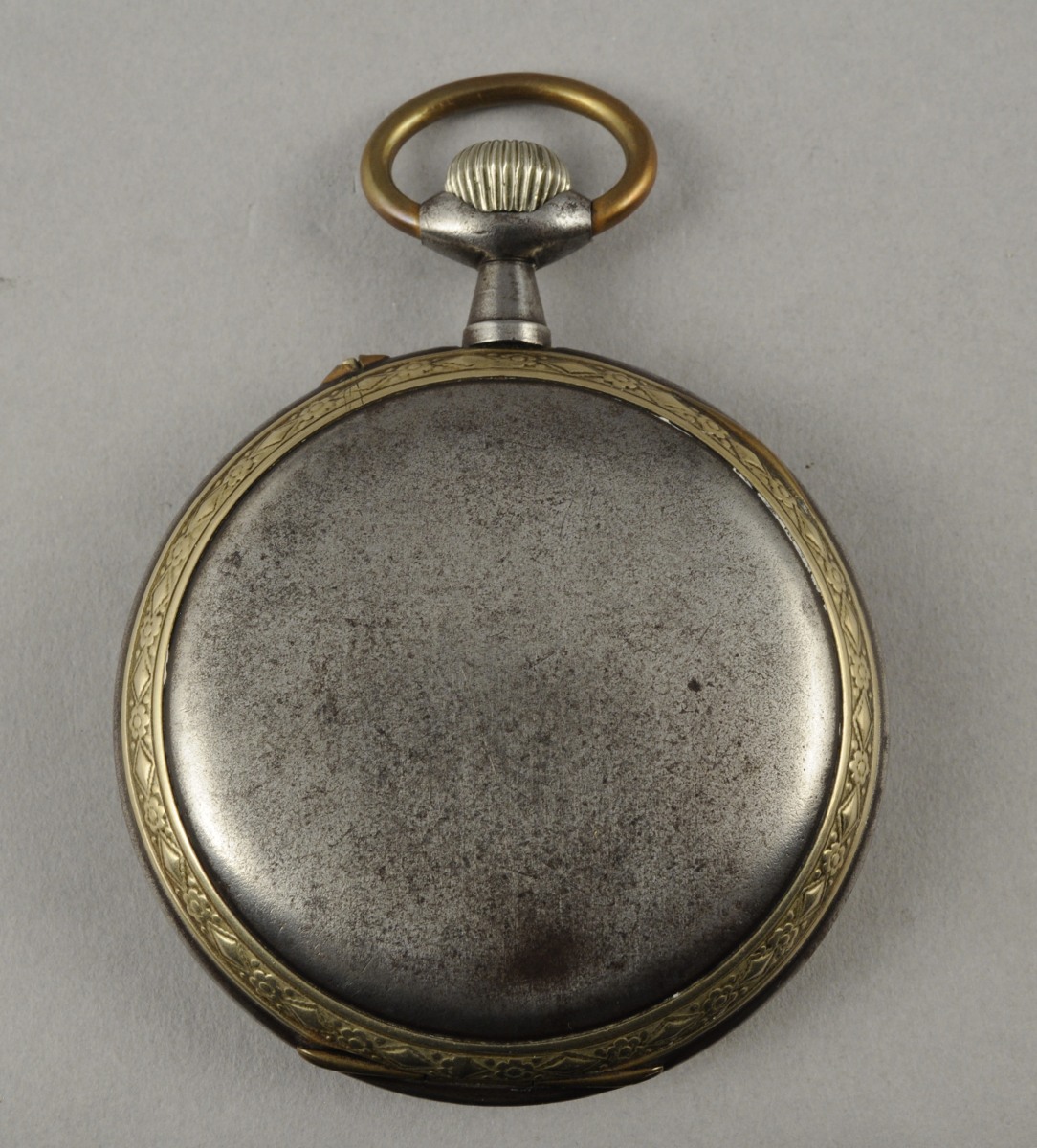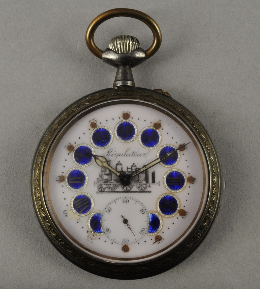 RÉGULATEUR DE CHEMIN DE FER à remontoir au pendant en acier. Double cadran émaillé blanc indiquant les heures en chiffres romains dans des cartouches en émail bleu translucide et les secondes. Le fond orné d'une locomotive et marqué "Régulateur". Le cadran et le dos du boîtier cerclés d'une frise de fleurons et losanges.