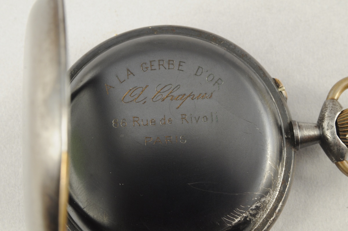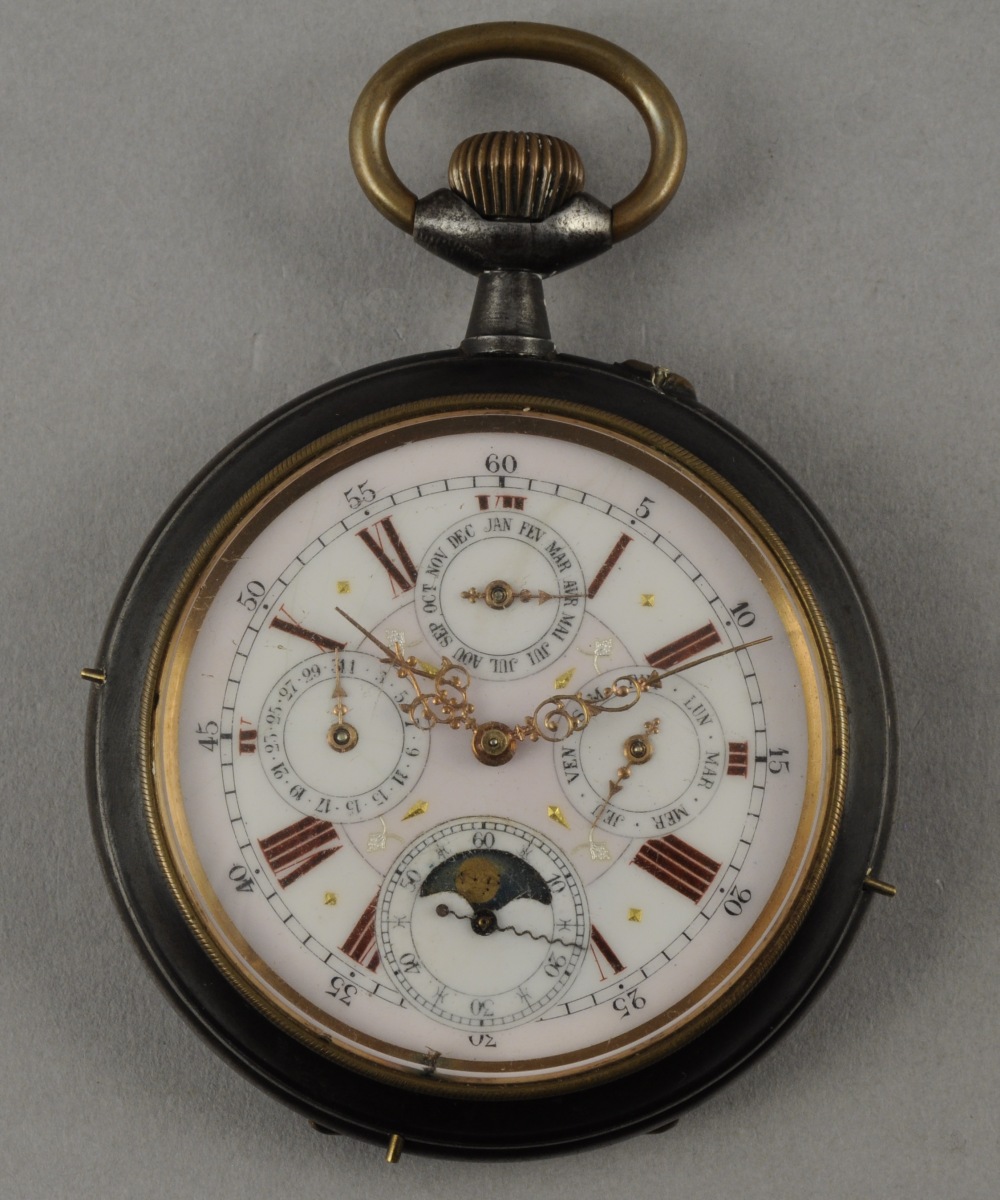 RÉGULATEUR DE CHEMIN DE FER à remontoir au pendant en acier à triple quantième et phases de lune. Cadran émaillé blanc et rose indiquant les heures en chiffres romains et les minutes en chiffres arabes. Il comporte trois compteurs: jour, mois, date et phase de lune à 6h. Aiguilles ouvragées en or. Le cache-poussière signé "À la Gerbe d'Or / A. Chapus / 86 rue de Rivoli / Paris".
