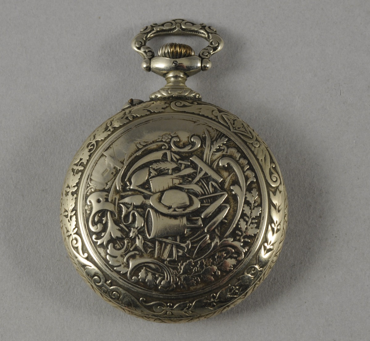 MONTRE DE GOUSSET à remontoir au pendant en métal argenté. Double cadran émaillé blanc indiquant les heures en chiffres arabes et les secondes. Le tour du cadran orné d'une couronne de chêne et laurier. Le dos du cadran à riche décor d'un trophée de l'agriculture notamment composé de fléaux, faux, rateau, seau et d'un chapeau dans un encadrement de feuillages stylisés. L'anneau de bélière de forme chantournée. Mouvement à échappement à ancre signé "LONGINES".