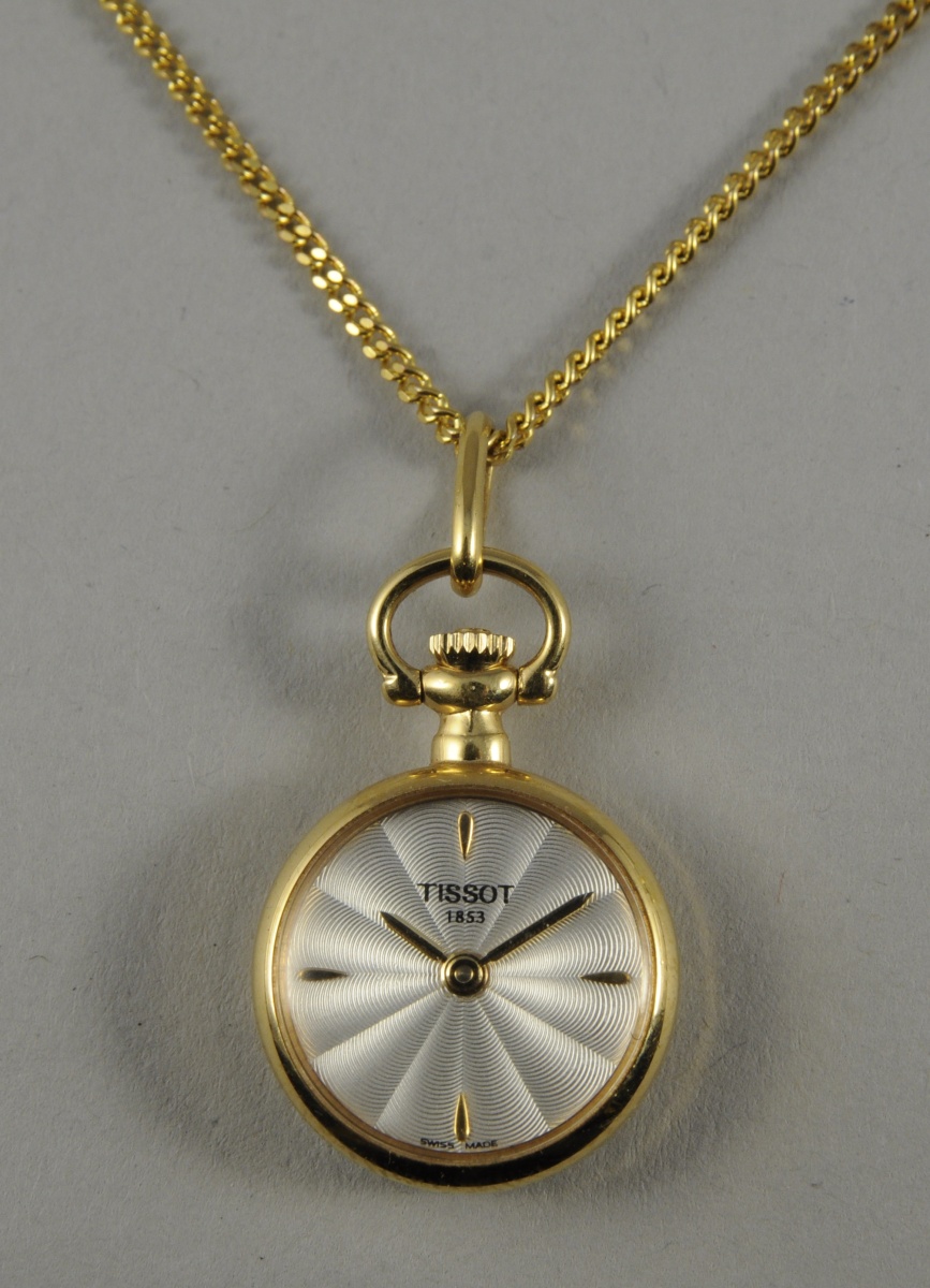 MONTRE DE COL en métal doré. Le cadran en métal guilloché. Les quarts à index bâtonnets. Signée "TISSOT 1853" et numérotée "Y 042 220". Mouvement à pile.