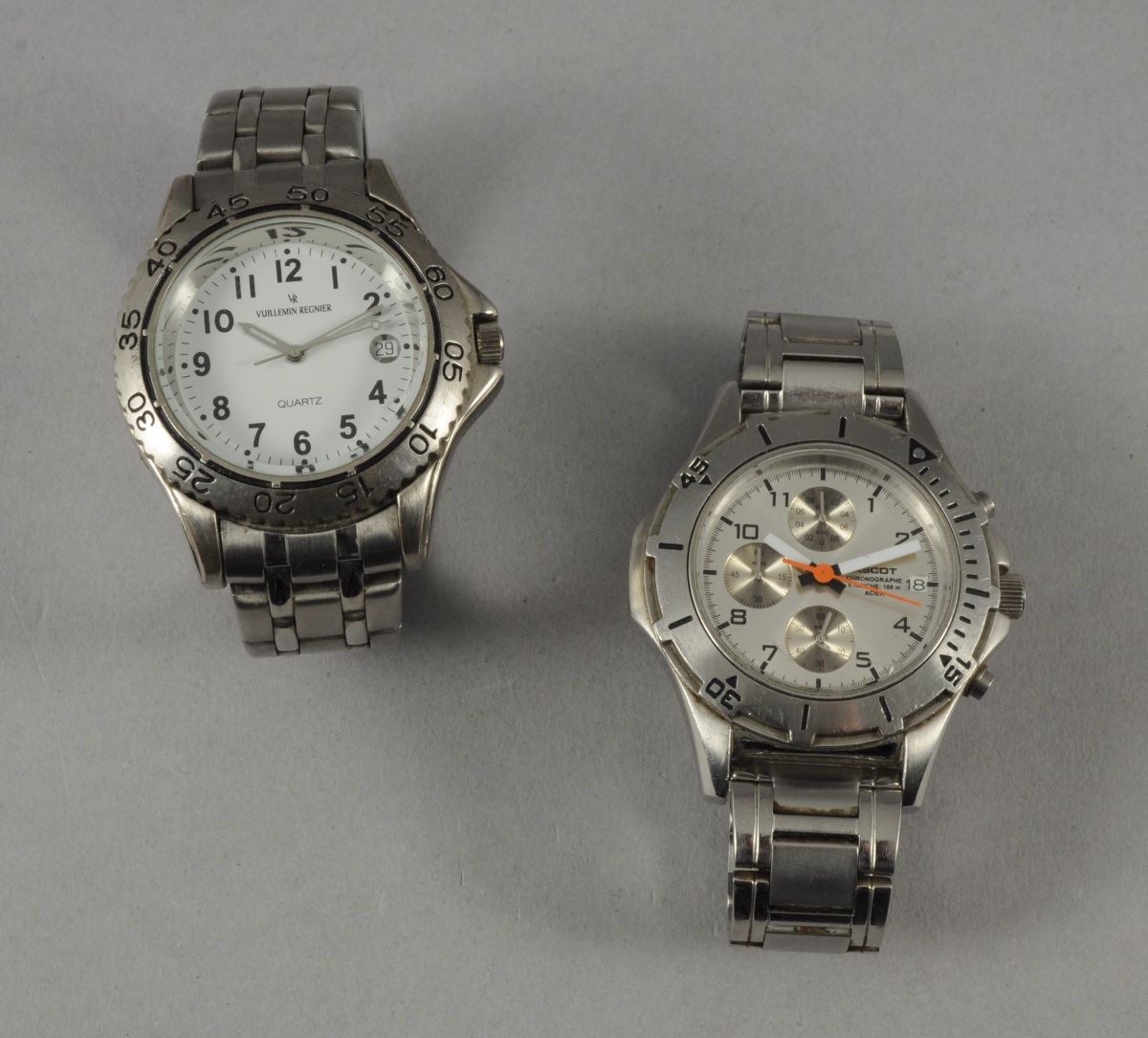 -La seconde à cadran blanc indiquant les heures en chiffres arabes. Guichet date à 3h. Signée "Vuillemin Regnier" et marquée "Quartz". Le dos du boîtier marqué "TD 850". Bracelet à maillons articulés en acier.