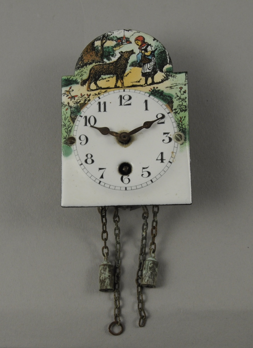 MOUVEMENT de PENDULE de table rectangulaire cintré émaillé à décor polychrome imprimé d'une scène extraite du conte "Le Petit Chaperon Rouge". Cadran circulaire indiquant les heures en chiffres romains.