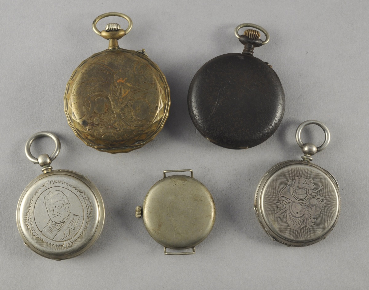 -La quatrième, à remontoir au pendant, en métal anciennement argenté. Le cadran émaillé vert indique les heures en chiffres arabes dans un encadrement en métal or. Le fond du cadran en orné d'une chromolithographie de forme ronde figurant les maréchaux Joffre et Kitchener. Elle porte la mention "Souvenir de la grande guerre / 1914-15". Le dos du boîtier orné de feuillages stylisés. Le cache-poussière marqué "Remontoir perfectionné".