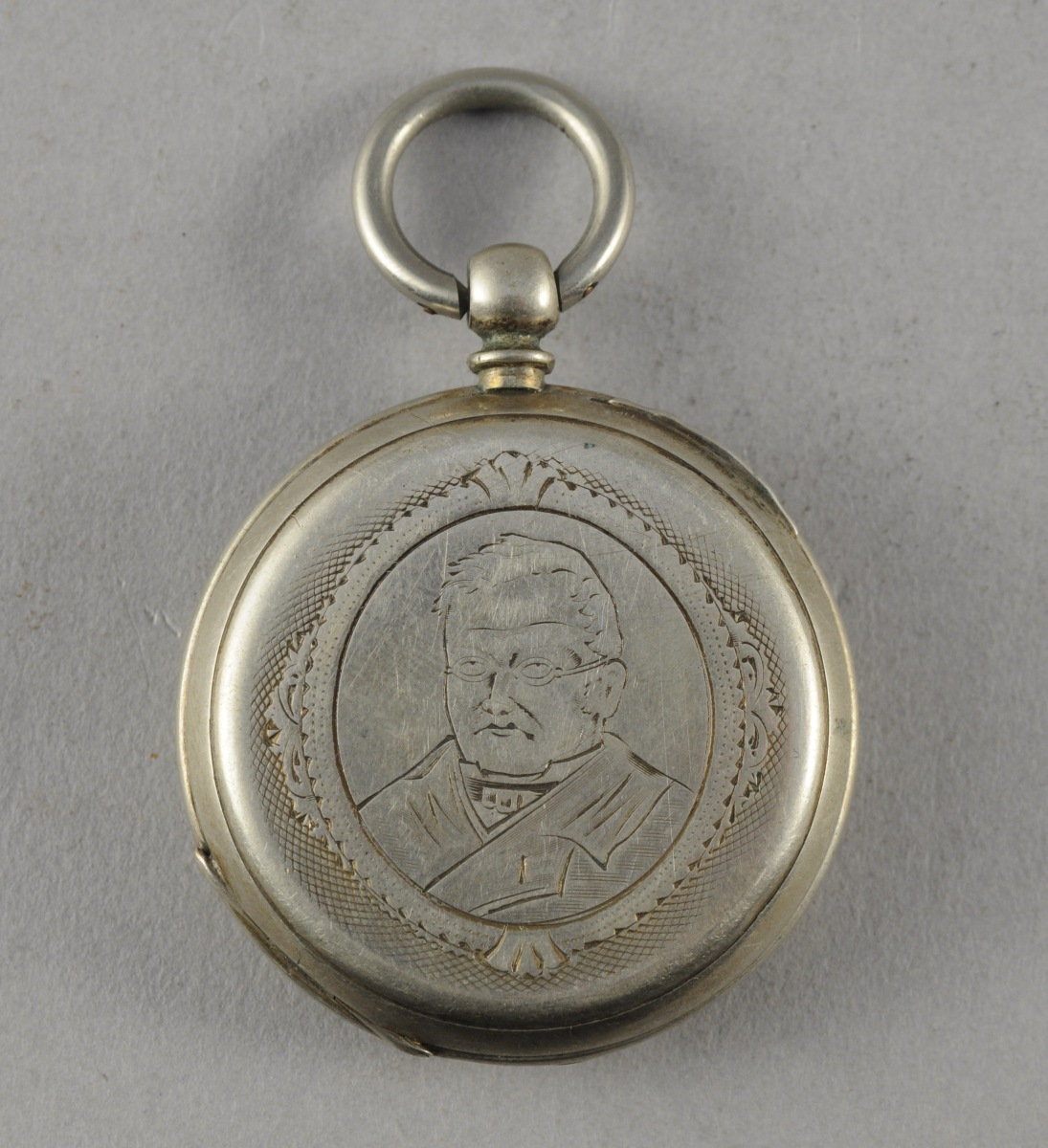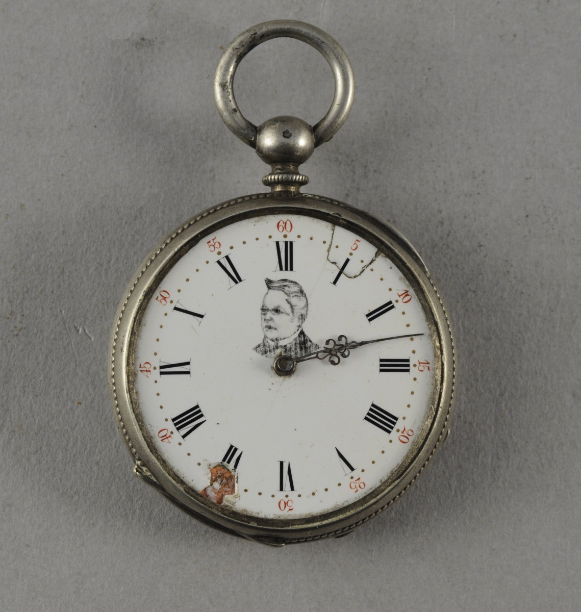 -La deuxième, à clef, en argent, présente un cadran émaillé blanc indiquant les heures en chiffres romains et les minutes en chiffres arabes. Il est orné du buste d'Adolphe THIERS (1797-1877) émaillé noir. Le dos du boîtier ciselé d'un trophée de chasse sur fond guilloché. Maître-Orfèvre A8I. Poinçon crabe. Seconde moitié du XIXème.