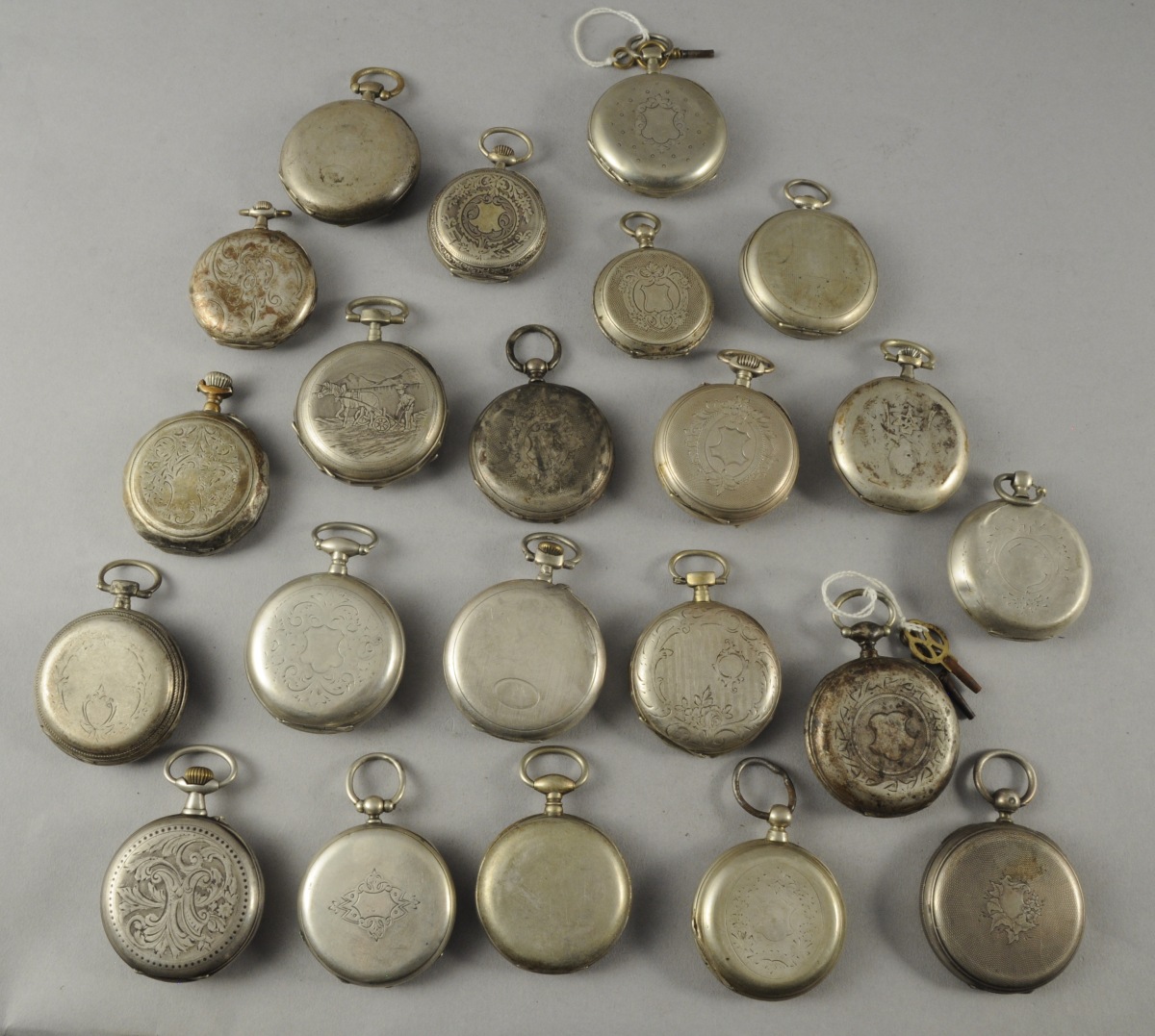 LOT DE 22 MONTRES DE GOUSSET en argent, à clef ou à remontoir au pendant. Il comprend notamment une dont le cache-poussière est gravé "Montre à huit jours / Du système Boussard", une signé de la maison "Gédé", une dont le boîtier est orné d'un homme labourant son champ à l'aide d'un cheval, plusieurs dont le cadran reçoit des rehauts d'or...