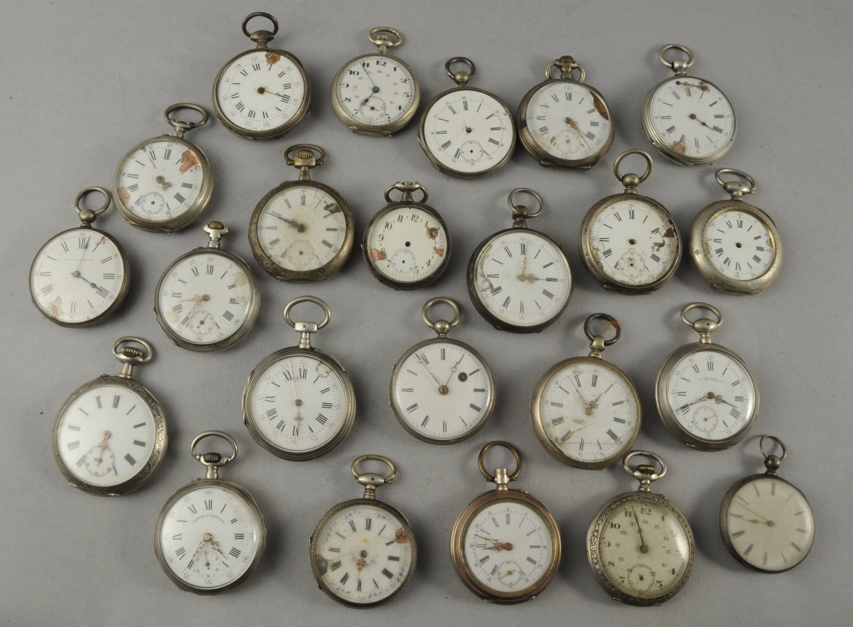 LOT DE 23 MONTRES DE GOUSSET en argent, à clef ou à remontoir au pendant. Il comprend notamment une dont le dos du boîtier présente un cartouche laqué or monogrammé "JB" dans un encadrement de feuillages stylisés, plusieurs à cadran double, une dont le cadran est émaillé d'un bouquet de fleurettes polychromes, une en partie laquée or dont le dos du boîtier est ciselé d'un cartouche figurant un château sur fond de guillochis...