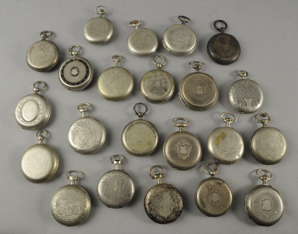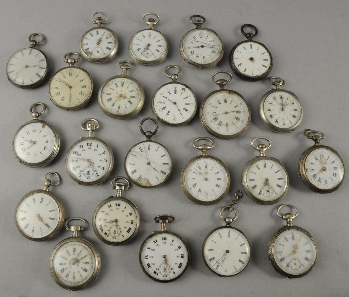 LOT DE 22 MONTRES DE GOUSSET en argent, à clef ou à remontoir au pendant. Il comprend notamment une dont le dos du boîtier présente un décor de guilloché émaillé noir, plusieurs à cadran double, une dont le cadran est émaillé de guirlandes de fleurettes polychromes rehaussés or...